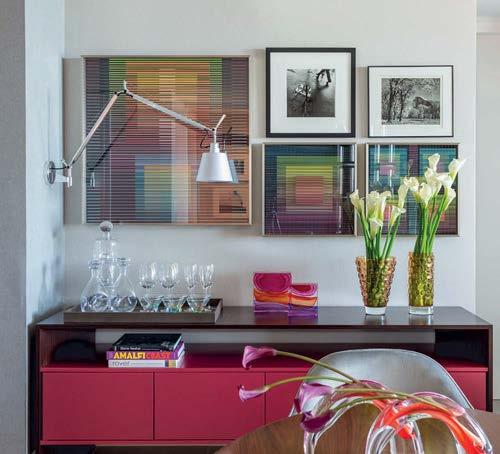 Top Mid-century furniture and pops of color accent this two-story living area, with Eames and MR chairs adding to the environment. Far left Sutherland teak chairs surround the concrete fire pit. Left White painted teak and rush chairs and contemporary chandeliers accentuate the traditional millwork in this dining room, featuring art by Hunt Slonem.
