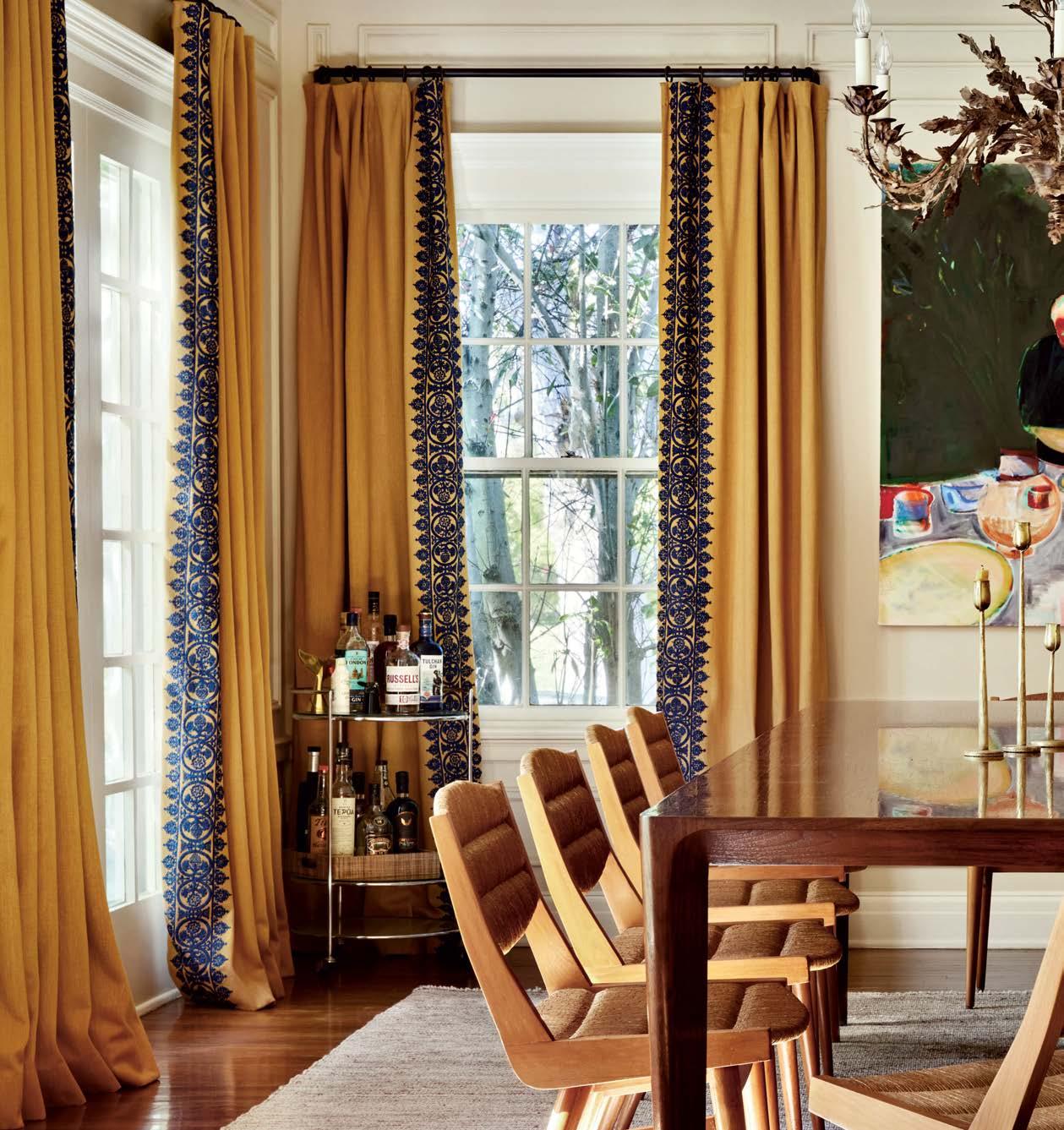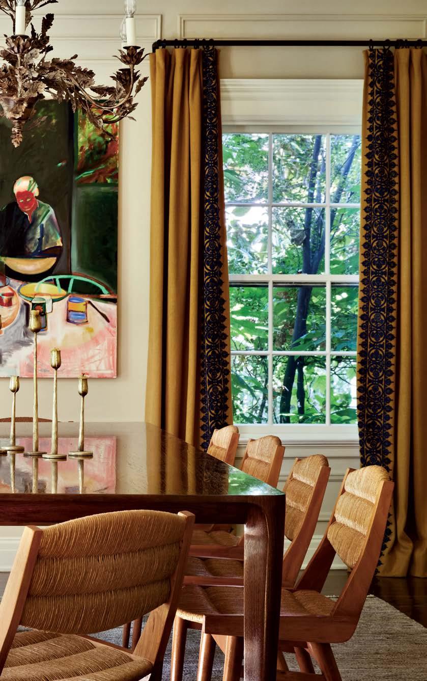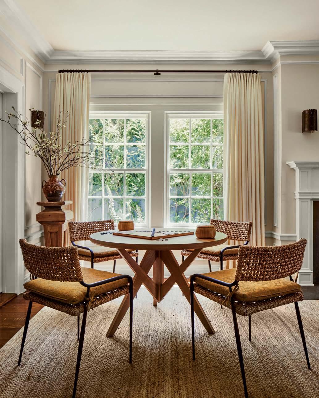 Much as the designer enjoyed scouring an array of Los Angeles antique shops, flea markets and websites like 1stdibs and Chairish for furnishings with her clients (the wife became an avid collaborator), Howe made an effort to bridge eras and styles for a more timeless look. The dining room, for instance, houses a Danish modern-inspired wood custom table surrounded by vintage wood-and-rattan chairs, backdropped by golden-hued draperies embellished with bold black embroidery. Not overly formal or stuffy, but not too casual either—and definitely not time capsule-y— the space exudes a relaxed, appealing elegance. The cheerful, detailed curtains became a jumpingoff point for the whole project, recalls the designer, noting that her suggestion of the unexpected combination of color and detail resulted in an enthusiastic yes from the homeowners early in the process. “We’re more on the classic side, but with a modern twist,” comments the wife.