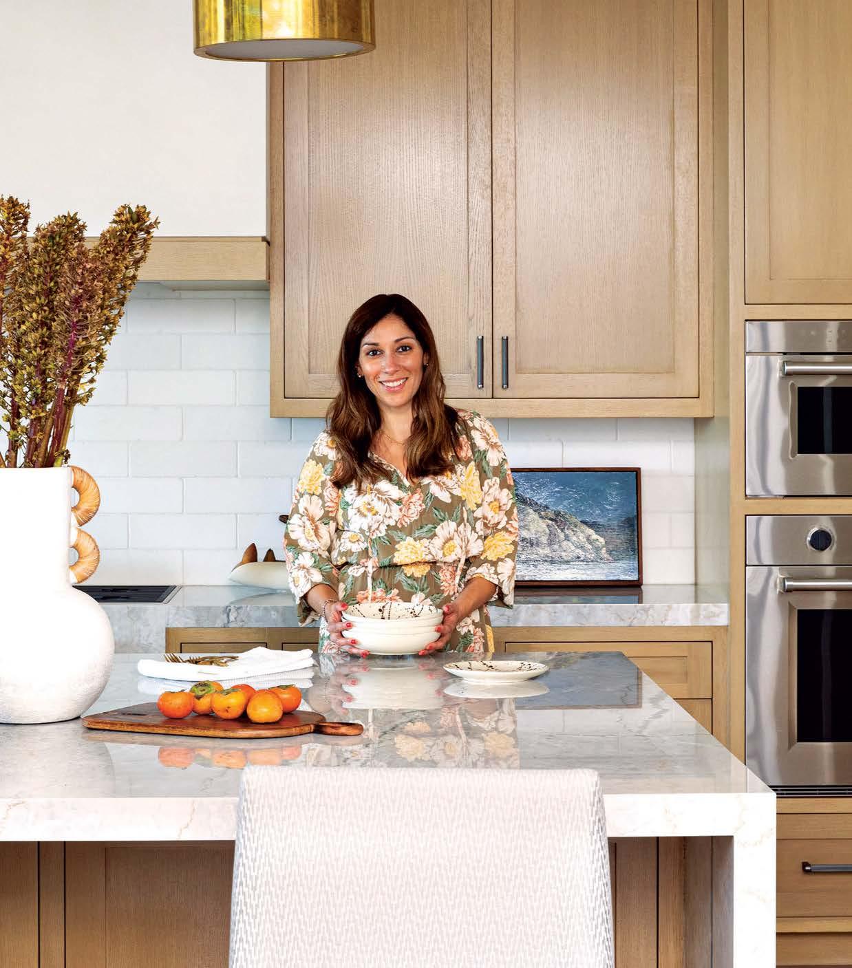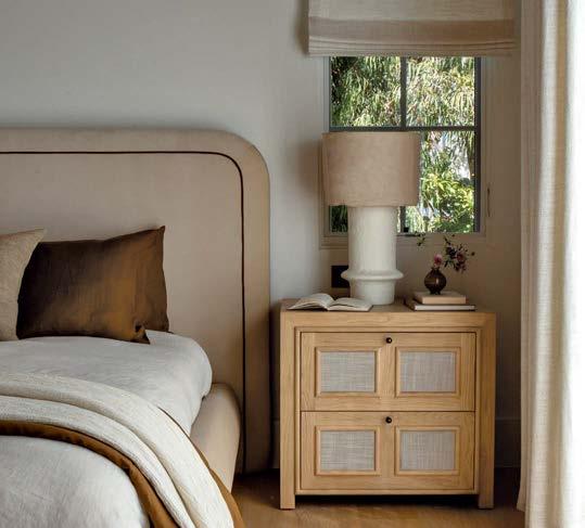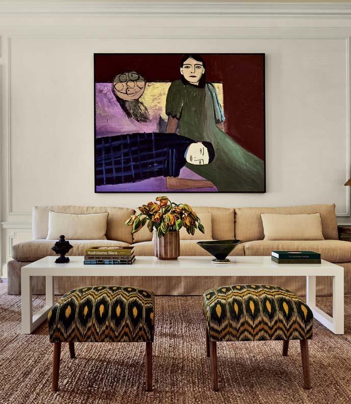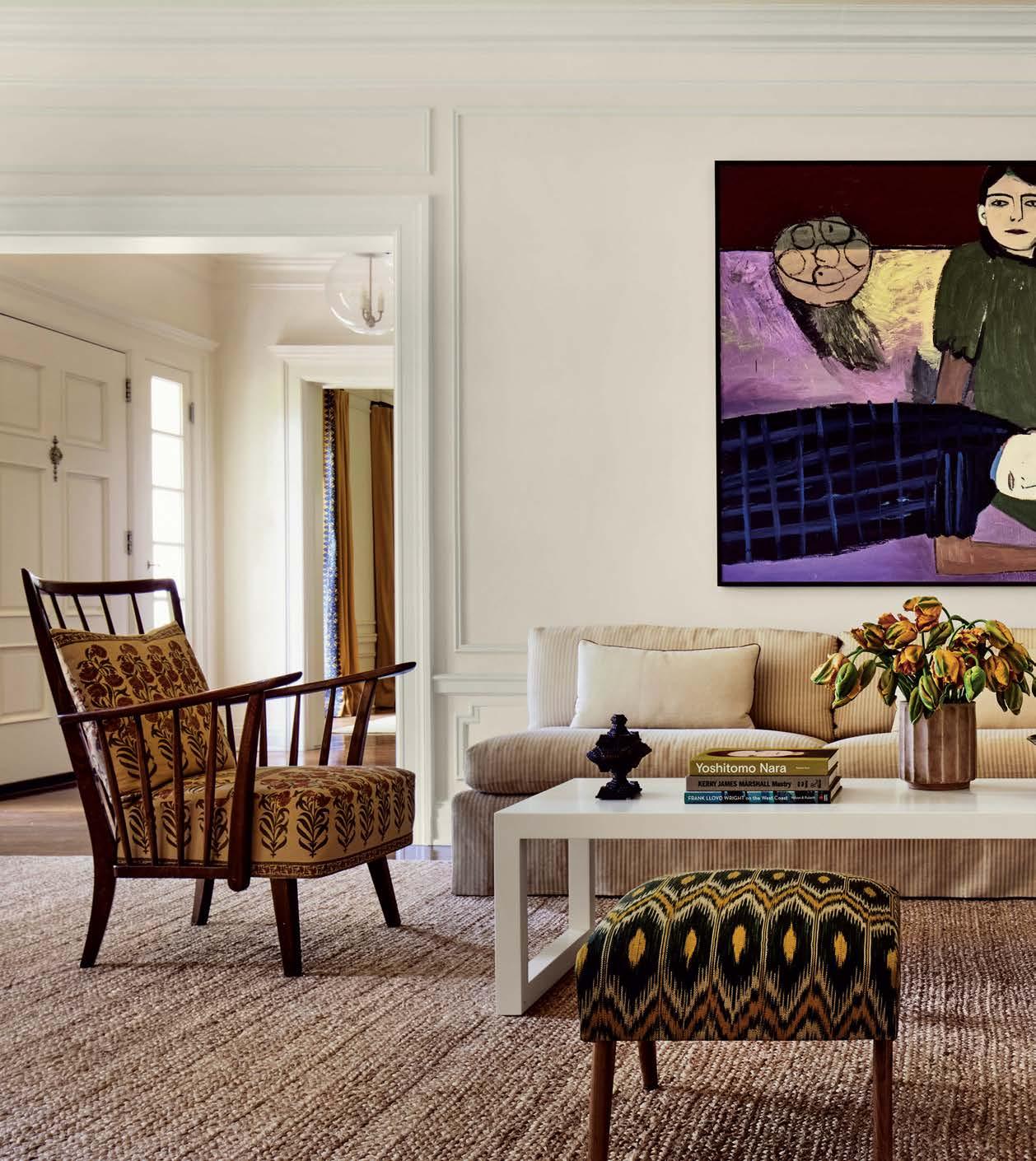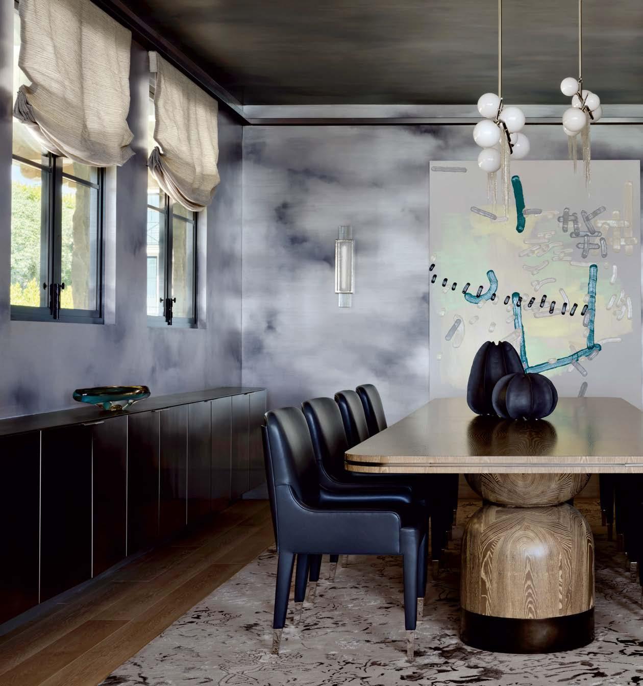 Much as the designer enjoyed scouring an array of Los Angeles antique shops, flea markets and websites like 1stdibs and Chairish for furnishings with her clients (the wife became an avid collaborator), Howe made an effort to bridge eras and styles for a more timeless look. The dining room, for instance, houses a Danish modern-inspired wood custom table surrounded by vintage wood-and-rattan chairs, backdropped by golden-hued draperies embellished with bold black embroidery. Not overly formal or stuffy, but not too casual either—and definitely not time capsule-y— the space exudes a relaxed, appealing elegance. The cheerful, detailed curtains became a jumpingoff point for the whole project, recalls the designer, noting that her suggestion of the unexpected combination of color and detail resulted in an enthusiastic yes from the homeowners early in the process. “We’re more on the classic side, but with a modern twist,” comments the wife.