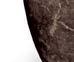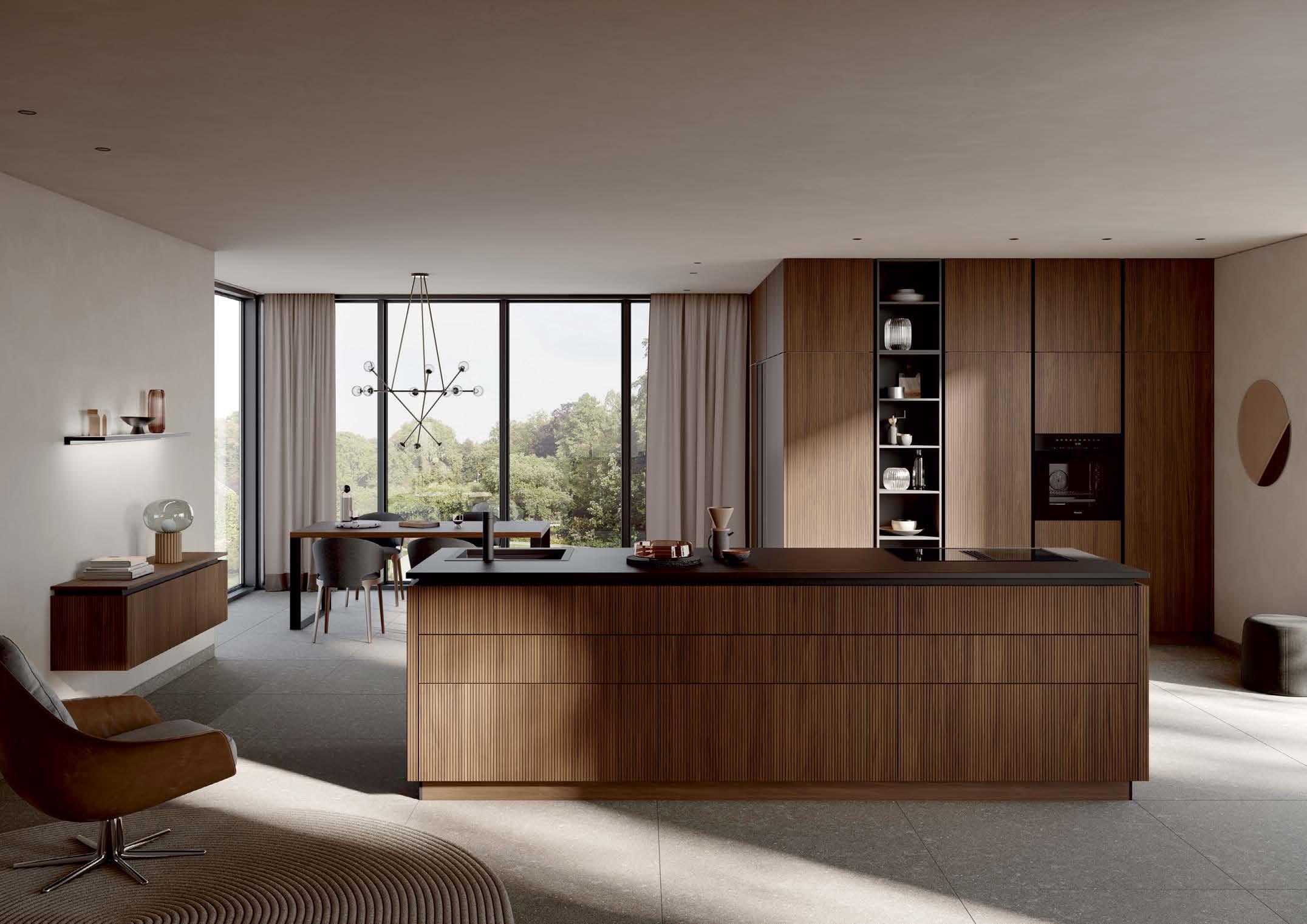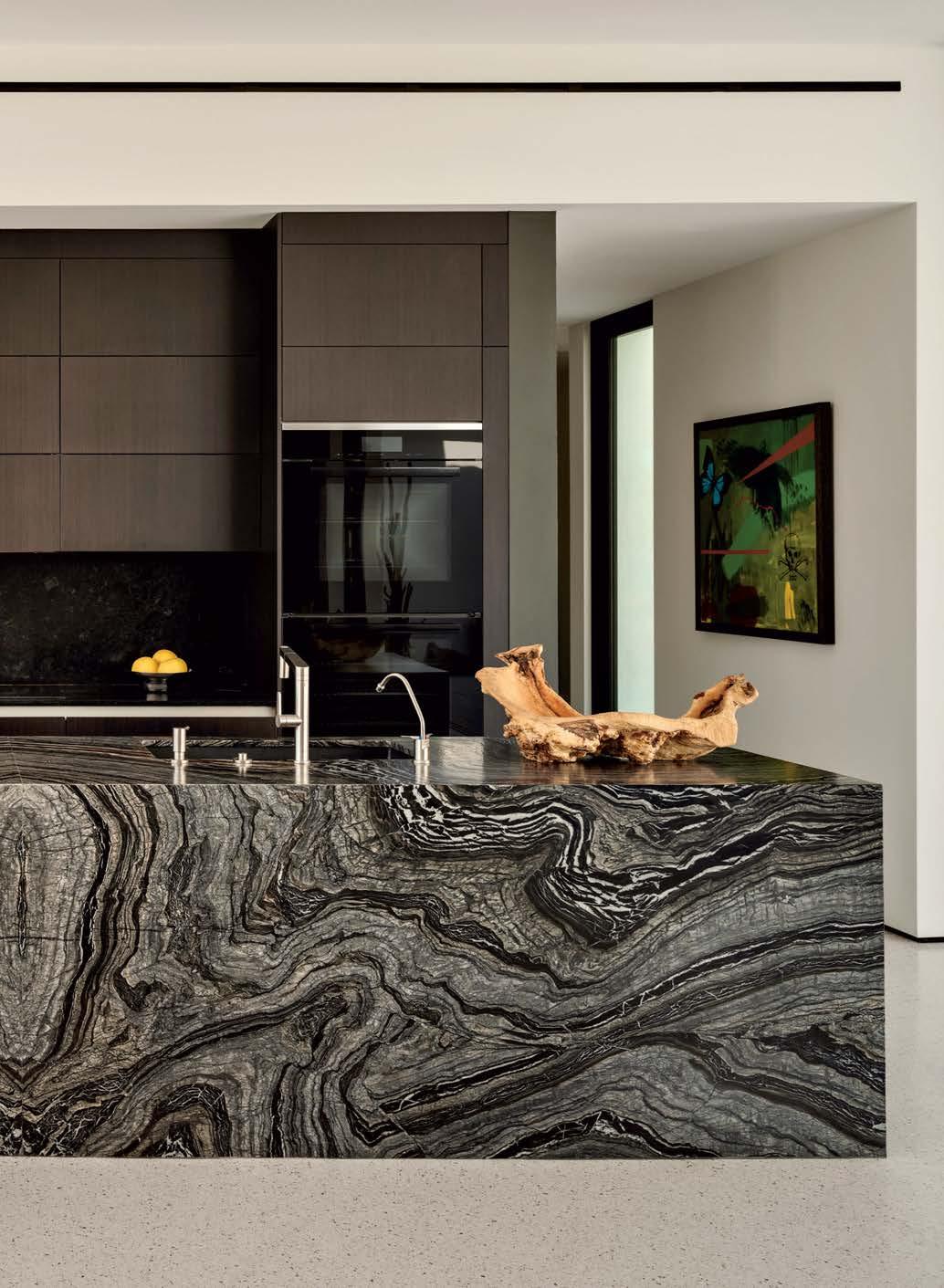 Richly veined leathered marble steals the show on the kitchen island, backdropped by dark Bauformat cabinetry. A custom teak ledge tops geometric undercounter wood panels from Architectural Systems, Inc. Baked