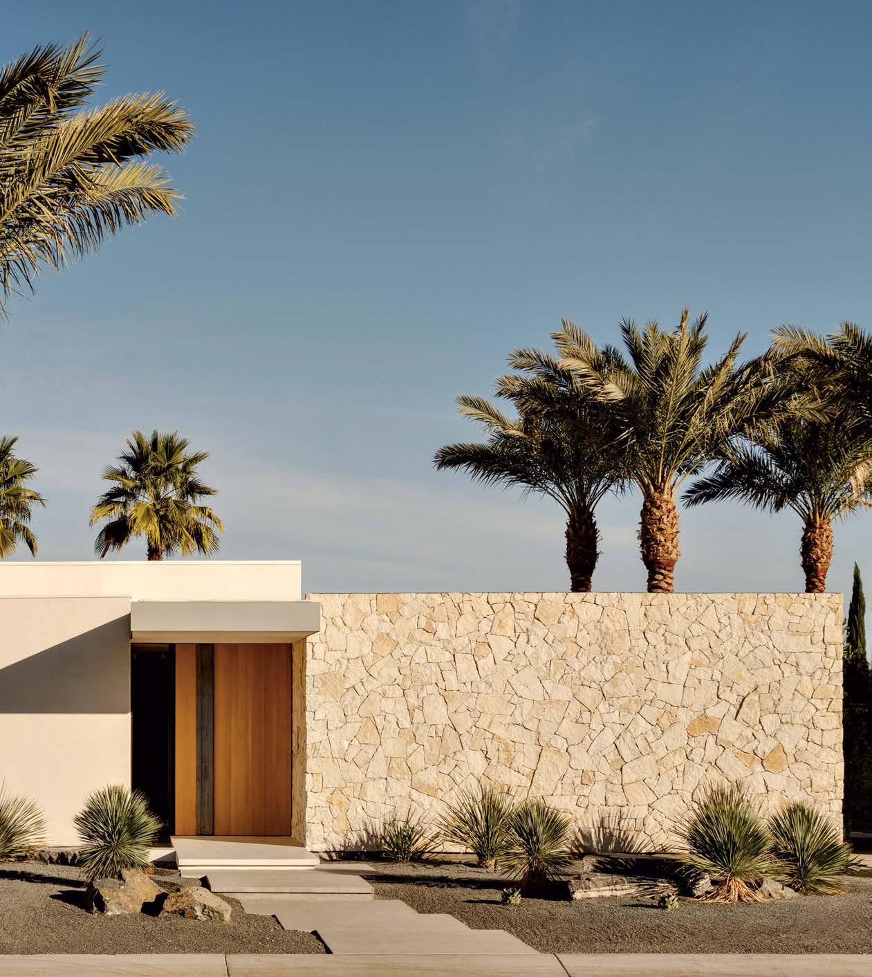 Previous page: White stucco juxtaposed with hand-chinked white limestone, via Pacific Stone Supply, celebrates contrast on the exterior façade, where a custom white oak pivot door serves as a focal point. Landscape designer Al Sambila chose date palms, yucca, agave and desert spoon plants to reflect the Palm Springs environment.