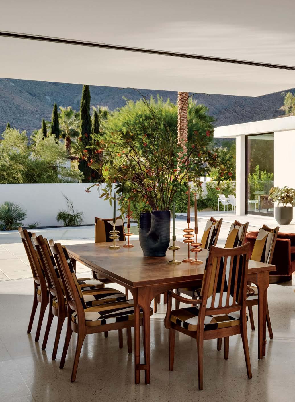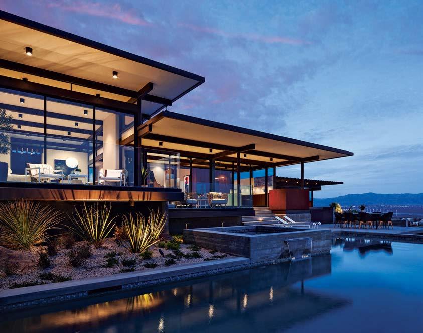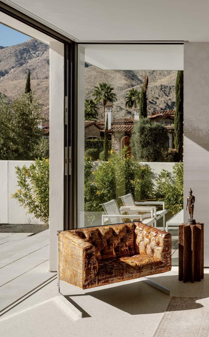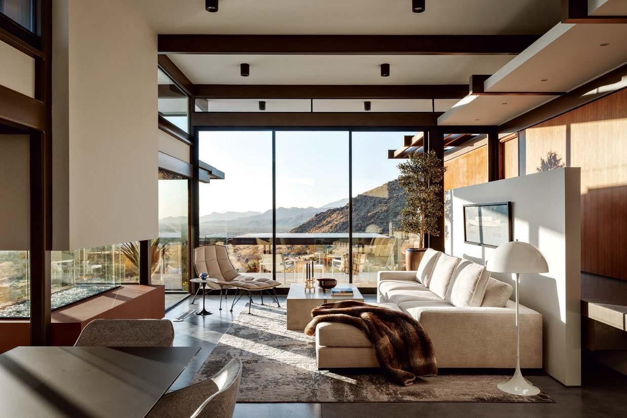 ON THE COVER: A 1960s Brown Saltman dining table and chairs, reupholstered in a Métaphores fabric, strike a traditional note against the contemporary design of a Palm Springs home’s great room. The house, a collaborative effort between designer Mark Brunetz, residential designer Stephen Strugala, general contractor Yann Debonne and landscape designer Al Sambila, features pocketing doors by Fleetwood Windows & Doors to connect the interiors with a patio and pool. Page 180