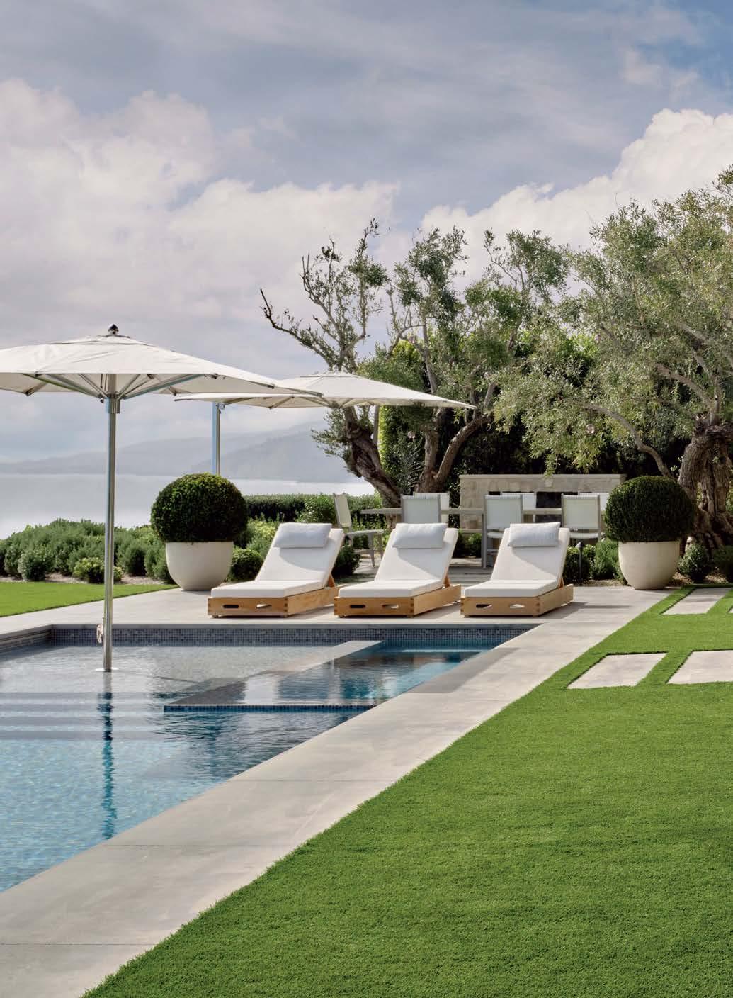 B&B Italia sofas and RH lounge chairs create a comfortable gathering spot near the fire pit. At the end of the pool, Sutherland chaises in a Perennials textile beckon. Mecox chairs sit in an outdoor dining area just beyond.