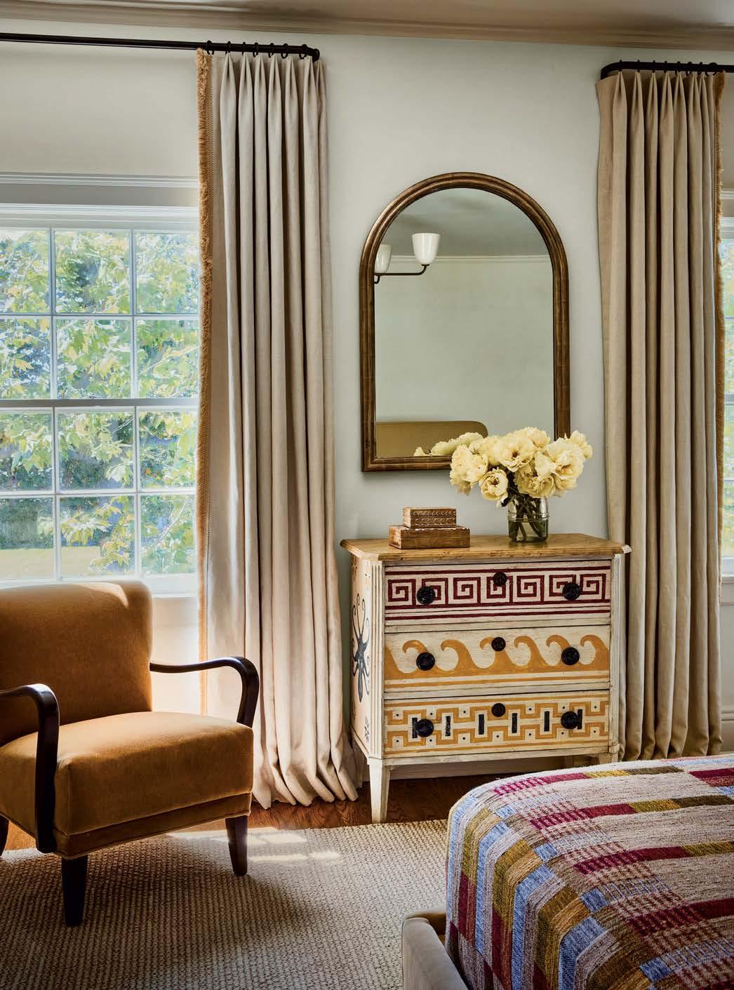 Opposite: In the same room, a hand-painted chest from Casa Gusto adds to the collected feel. The 1940s lounge chair, another Panoplie find, is covered in a mustard velvet. A Marc Phillips Rugs wool carpet adds warmth.