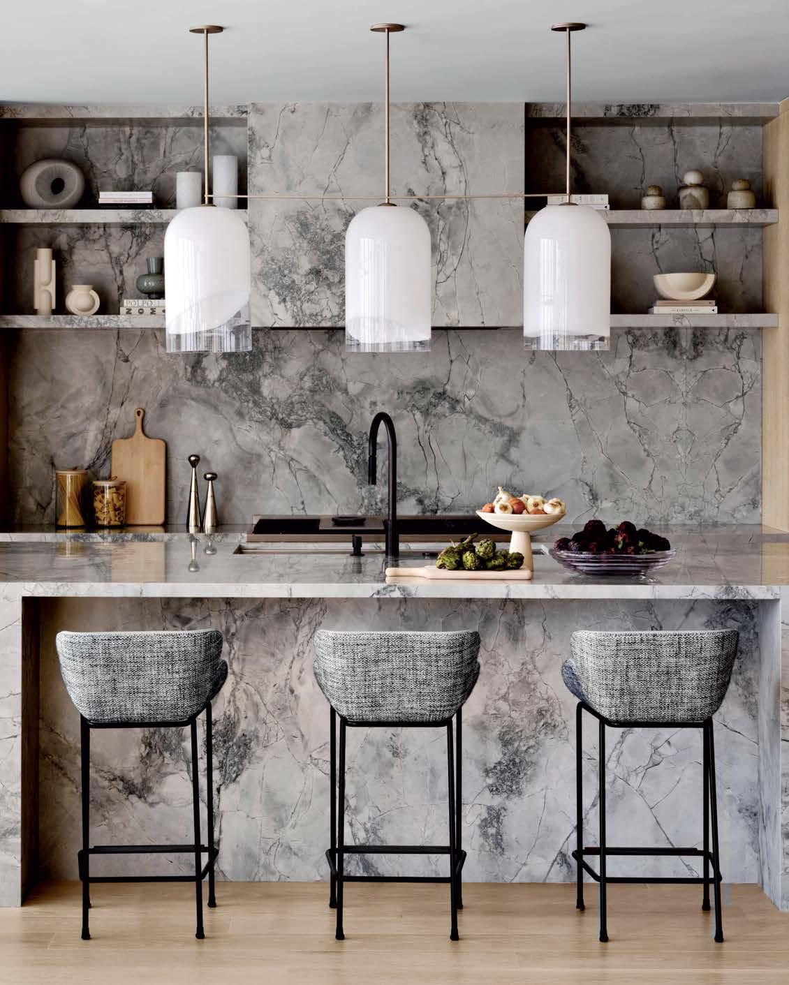 Opposite: Super white quartzite spills across the kitchen island, counters, walls, shelving and hood for an immersive effect. An Articulo Studios light fixture punctuates the island, and stools from Studio Van den Akker feature a Rogers & Goffigon fabric.