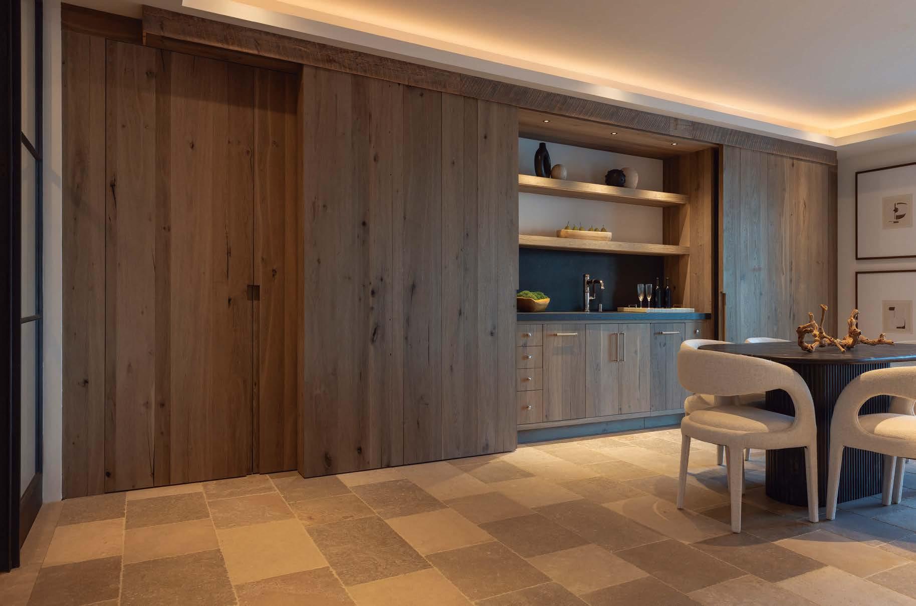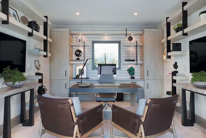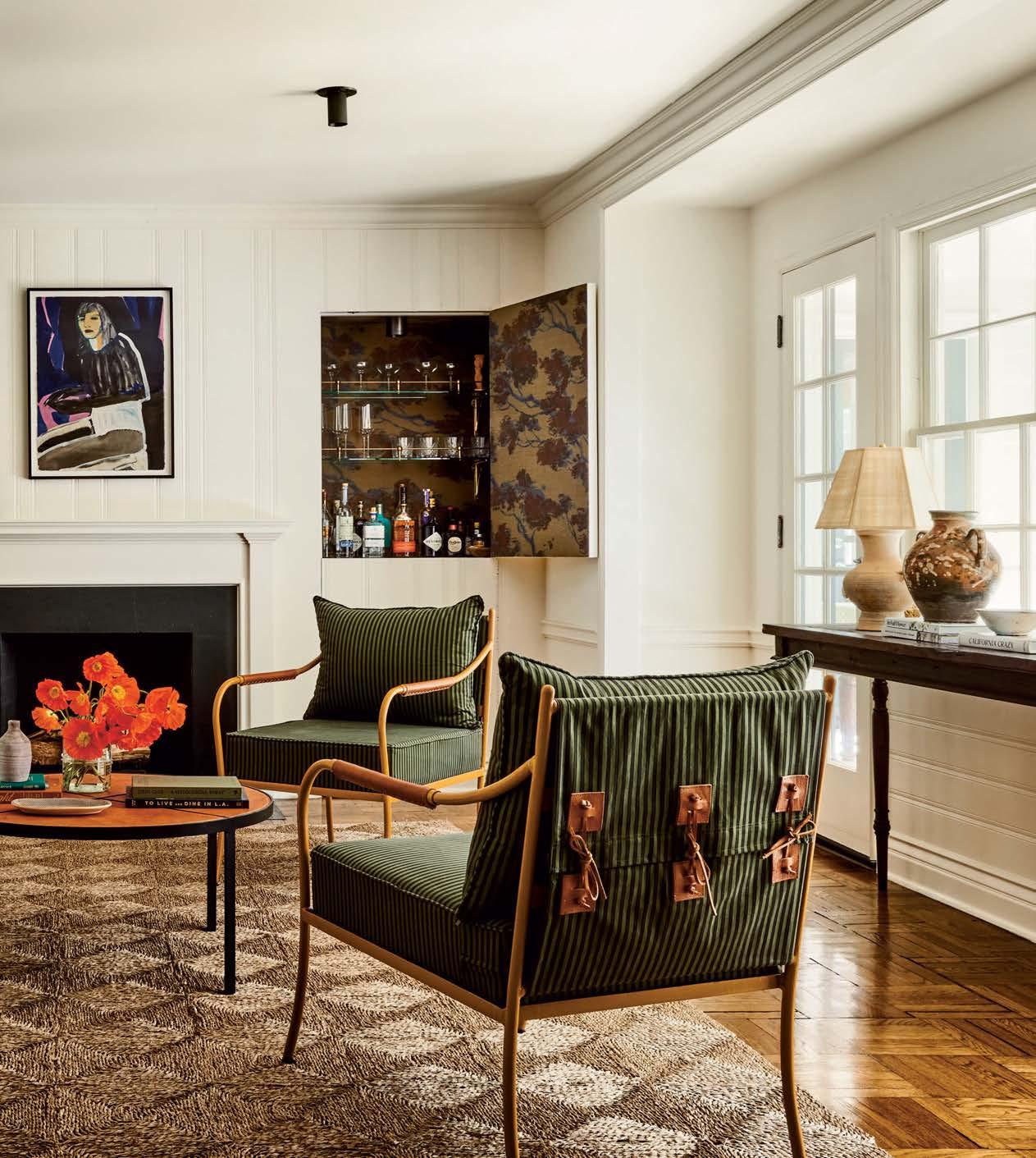 the lounge’s leathertopped coffee table and chairs finished with Howe London striped upholstery. A hidden bar is lined with a Josh Greene Design grass cloth. The rug is Rush House and the art is by Mònica Subidé.