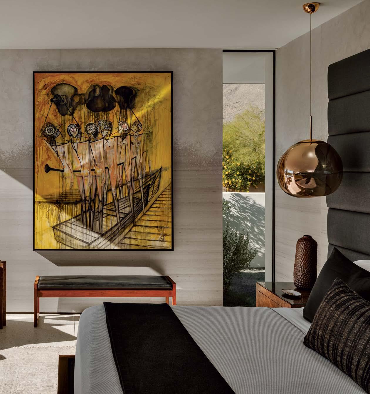 Acople, Lubricacion, Engrace by Miguel Angel Méndez overlooks the owners’ bedroom, backed by a Phillip Jeffries wallcovering. A Milo Baughman chair wearing a Knoll fabric rests beside a Brown Saltman bench and custom bed. The pendant is Tom Dixon.