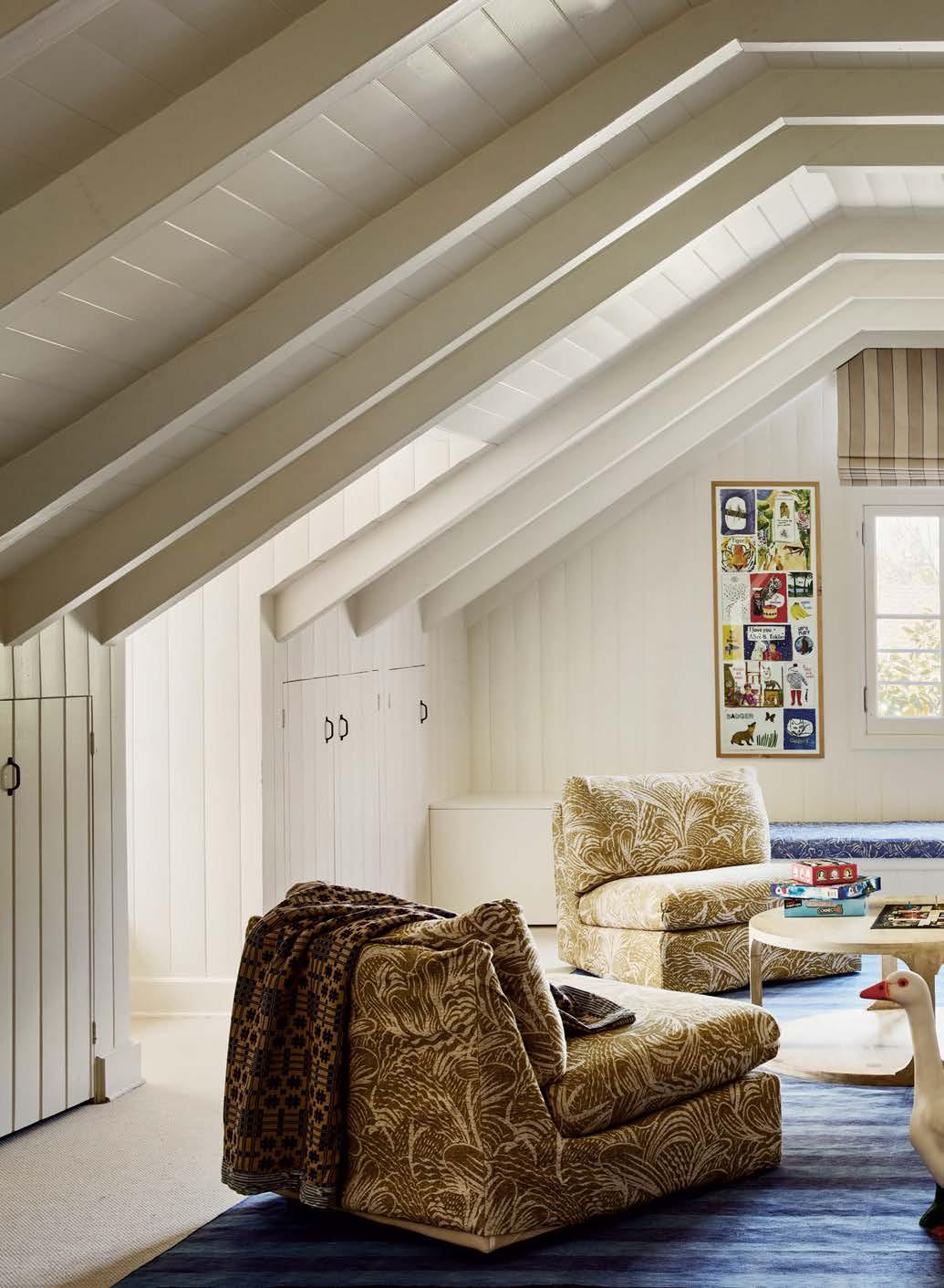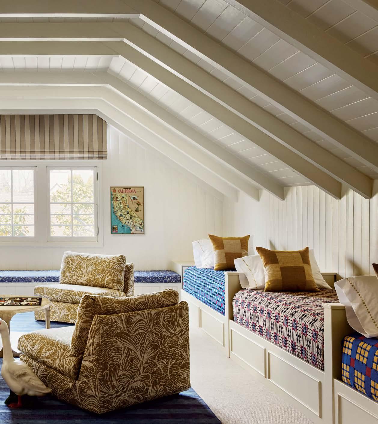 Transformed into a play space for the children, the attic features bunk beds dressed in Gregory Parkinson textiles. The slipper chairs are updated with a Fermoie fabric from Hollywood at Home. The cotton dhurrie is from at From Jaipur With Love.