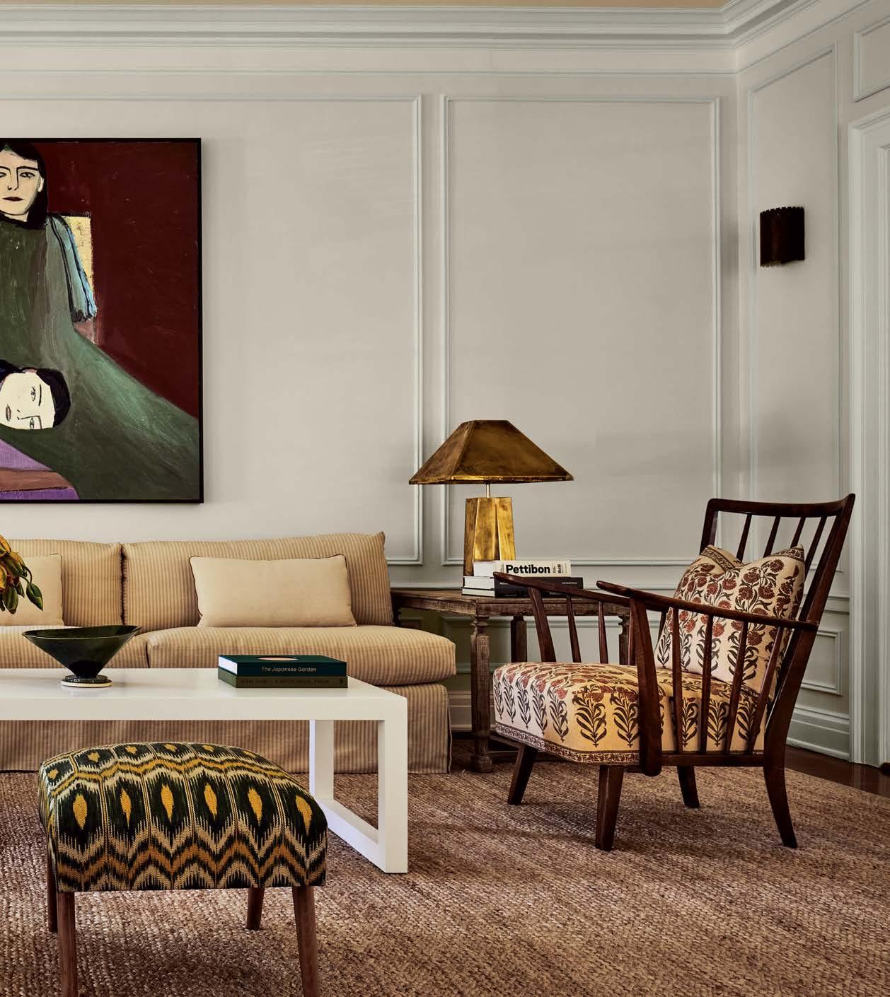 Previous page: The living room’s custom sofa, in a Michael S Smith Inc. Jasper Collection classic stripe, is paired with 1940 chairs from 1stdibs enhanced with Arjumand’s World textile. The brass table lamp is Paolo Moschino and the artwork is Mònica Subidé from Megan Mulrooney.
