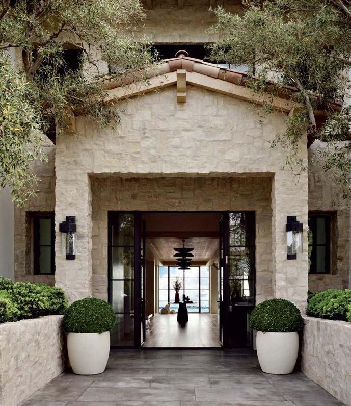 Previous page: Landscape architect Will Bailey offset the lines of the front façade with olive trees that gracefully undulate toward the entry. Rustic Kansas Rubble limestone creates a textural old-world aesthetic set against the exterior’s white, smooth-finish stucco walls.