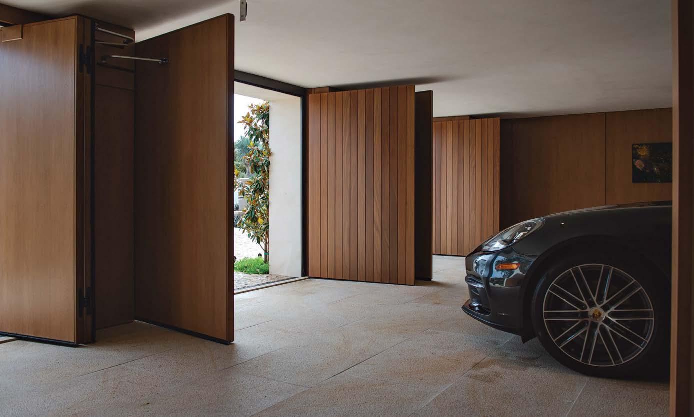 During another martini-fueled meeting, residential designer Stephen Strugala refined an I-shaped floor plan anchored by a central great room. Private quarters are carefully balanced: The owners’ bedroom wing, a secondary bedroom, a larger guest suite referred to as the home’s casita (with its own kitchen and garage) and an office all converge, through halls adorned with art, into the great room—which is the home’s focal point and primary socializing area. Imagined as a space with the flexibility to host large gala events, it encourages indoor-outdoor living. Lengthy 30foot sliders on both sides pocket away completely, creating a breezy open space covered by a cantilevered roof that appears to levitate. “Having sliders that open on both sides of a house is more of a Los Angeles concept—you don’t see it as often