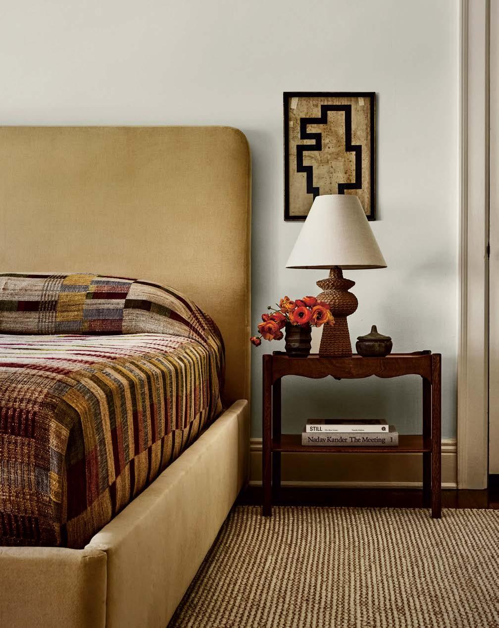 Above: The primary bedroom’s bespoke bed frame is swathed in a Loro Piana velvet. Beside lies a nightstand from 1stdibs with a ceramic lamp by Courtney Gertler of Cour Studio, sourced from Panoplie. The art is vintage.