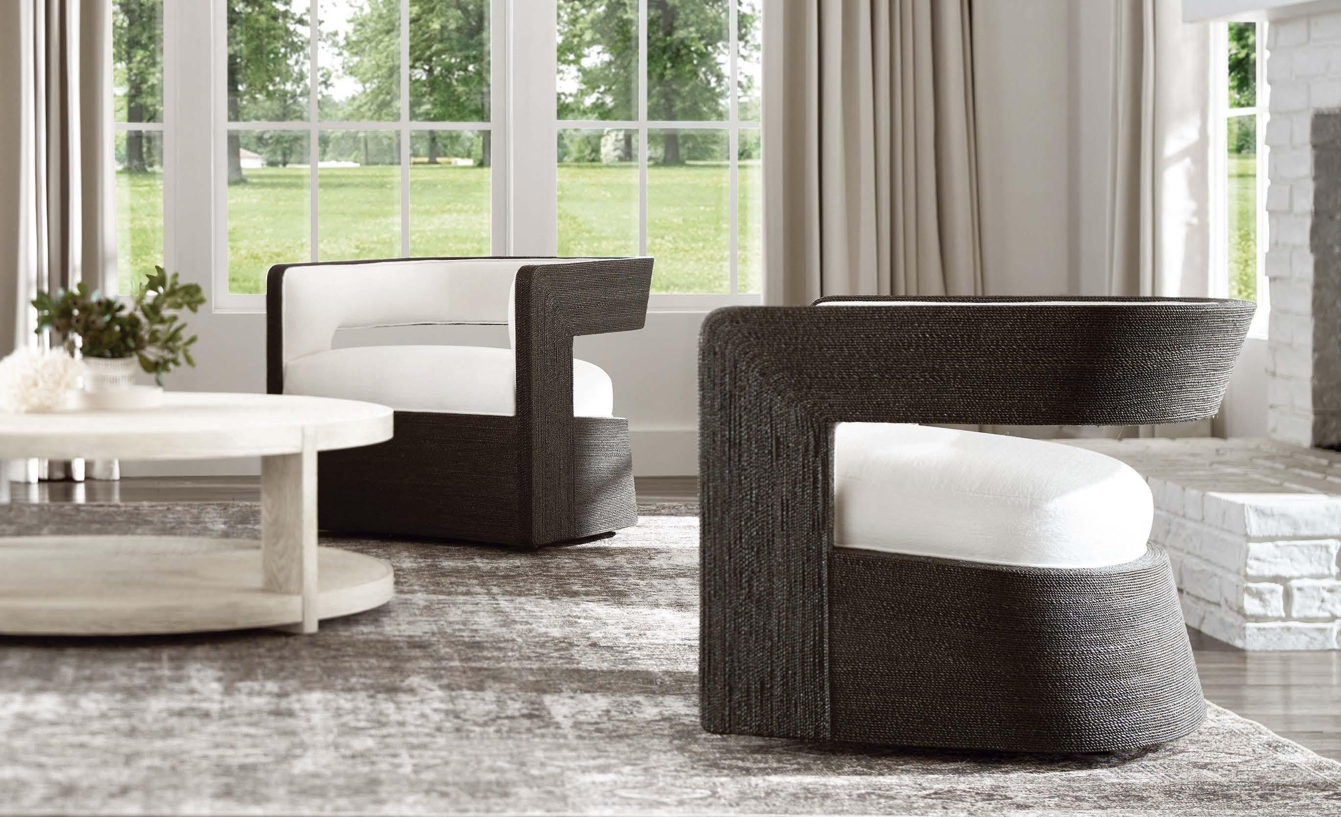 For the rear terrace that stretches out to a serene pool, the designer chose furnishings in keeping with the interior’s light tones and rounded forms, while landscape architect Will Bailey’s plant choices further temper the architecture’s harder lines. “We did lots of different textures and greens because Southern California gardens really need to perform all year,” explains Bailey. “It’s a loose, native coastal palette of grasses, edible natal plums and succulents, made statelier with olive trees and boxwood.” The aesthetic complements what Hunter calls the “restrained drama” of the home. “This house needed a certain balance, and I think we really got it,” he reflects. “The design is very energetic in ways; there’s a real vitality here, but it’s also meditative—and just happy.”