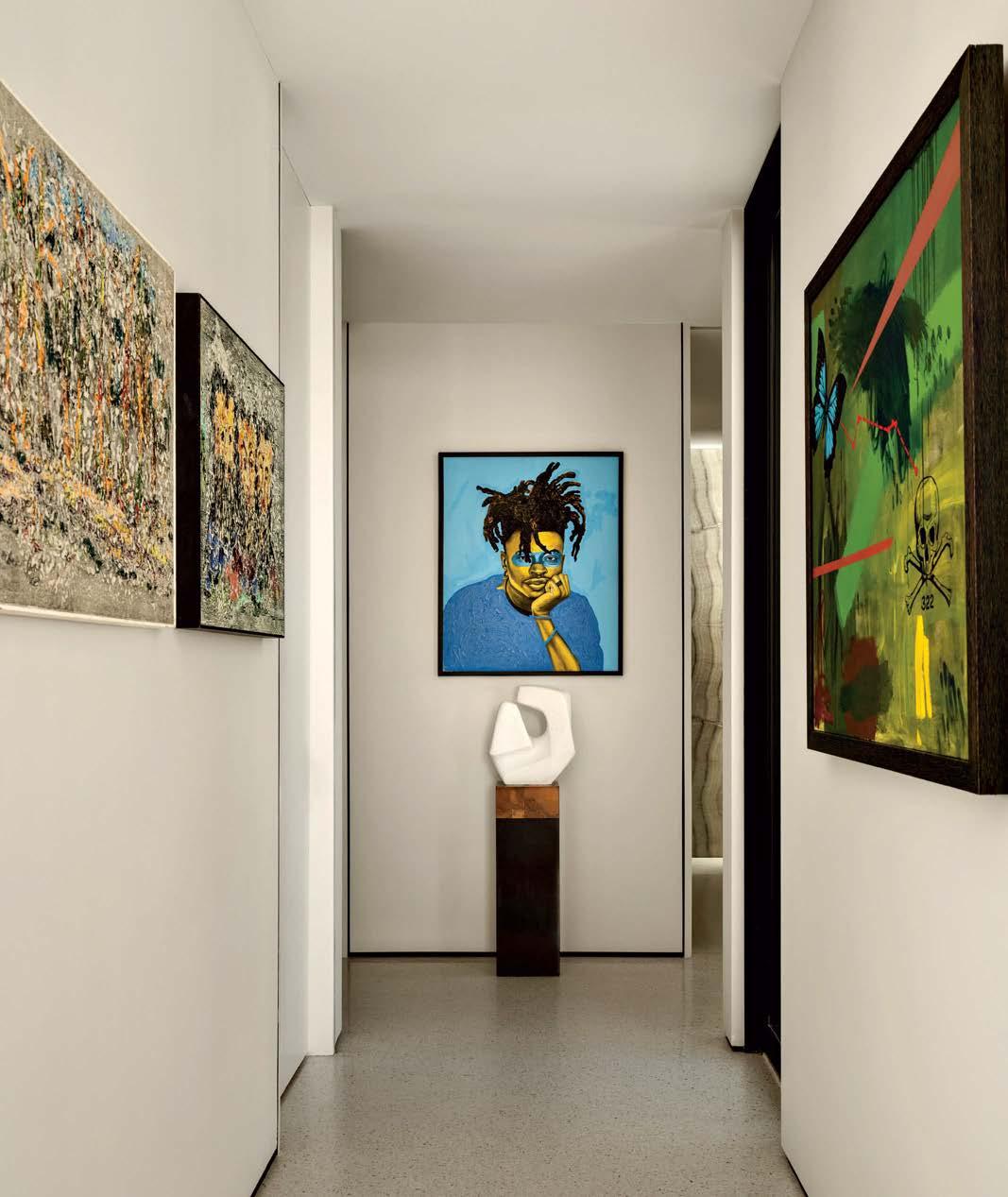 A hallway on the far side of the home is a gallery-like experience with Deep Reflection by Theophilus Tetteh (back wall), The Grassy Knoll by Rafael Lopez-Ramos (right wall) and 1960s works by Harry Mintz (left wall). The Paul Evans plinth is topped by a raw white marble sculpture.