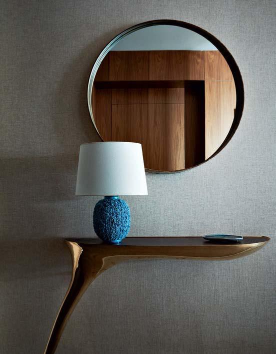 Above: Mirror artwork by Allison Eden Studios adorns the wife’s office, backed by a marbled cork Innovations wallcovering. Slipper chairs by Bright from Thomas Lavin wearing a Holly Hunt textile flank a Cuff Studio table. A floor lamp from Visual Comfort & Co. provides illumination.