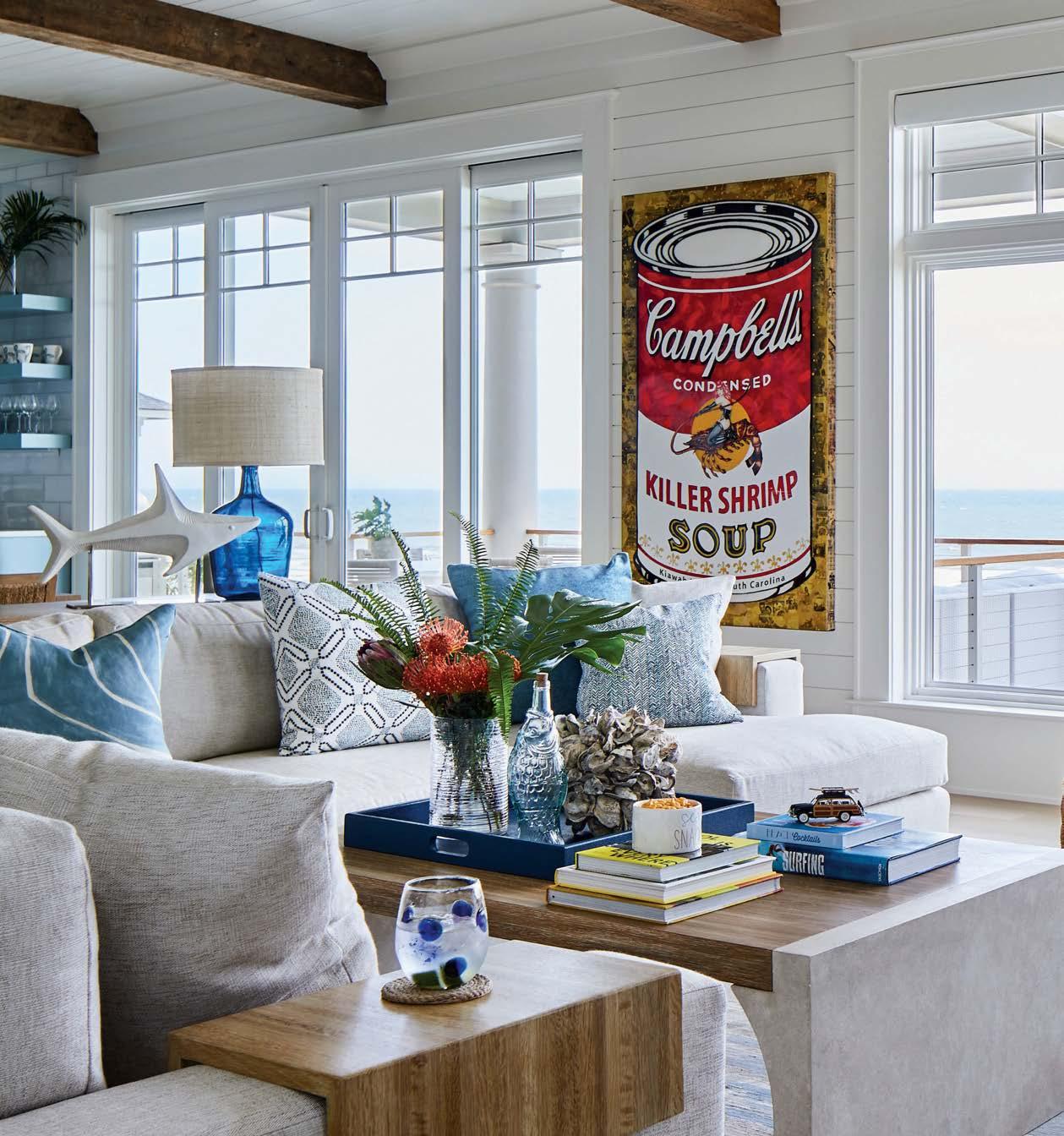 Tapping interior designer Laura Page Bischofberger to follow this pop art thread was a no-brainer, as the clients had already worked with her design firm before. Regular visitors to Kiawah Island, the Kaminkows were vacationing at a local resort appointed by Bischofberger’s colleagues when they learned of a beachfront property for sale. Authored by architect Wayne Windham, the abode boasts traditional coastal hallmarks like high ceilings, shiplap walls and free-flowing spaces. And thanks to the timing of their shoreside purchase, the couple could tweak Windham’s three-story residence to their specialized requests.