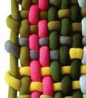 Today at her Elephant Gallery studio, Vissepó carves those same shapes into wood or hard linoleum, pressing directly onto paper to create minimalist silhouettes. Alternately, she’ll layer stamped impressions to render abstract landscapes. For her cloth tapestries, she swaps water-based paints for more permanent oil-based inks, brightening her black-linen backdrops using bold gradient hues for highcontrast intensity. These jewel-like emblems are frequently cut out, layered atop cotton or raw Belgian linen, then embroidered by hand onto the final composition for additional dimension.