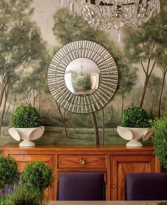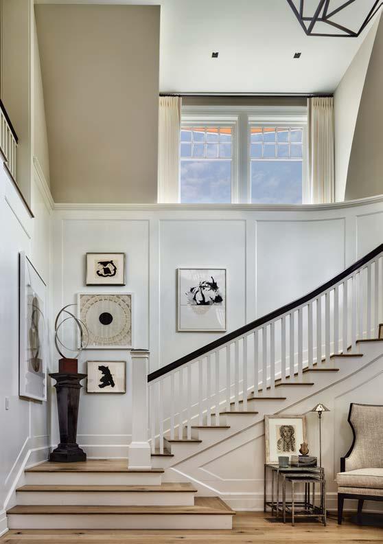interiors, Ingram embellished classic detailing by playing with scale and proportion. “I was able to take a language of traditional millwork profiles—casings, baseboards, cornices—and animate them a bit,” notes the residential designer, who also mimicked the dining room’s mirrored wainscotting in the stair balusters. “There’s a dance between buttoned up and playful: Moments of exuberance keep things grounded on one side of the spectrum, but fanciful on the other. That’s the magic of this house.”