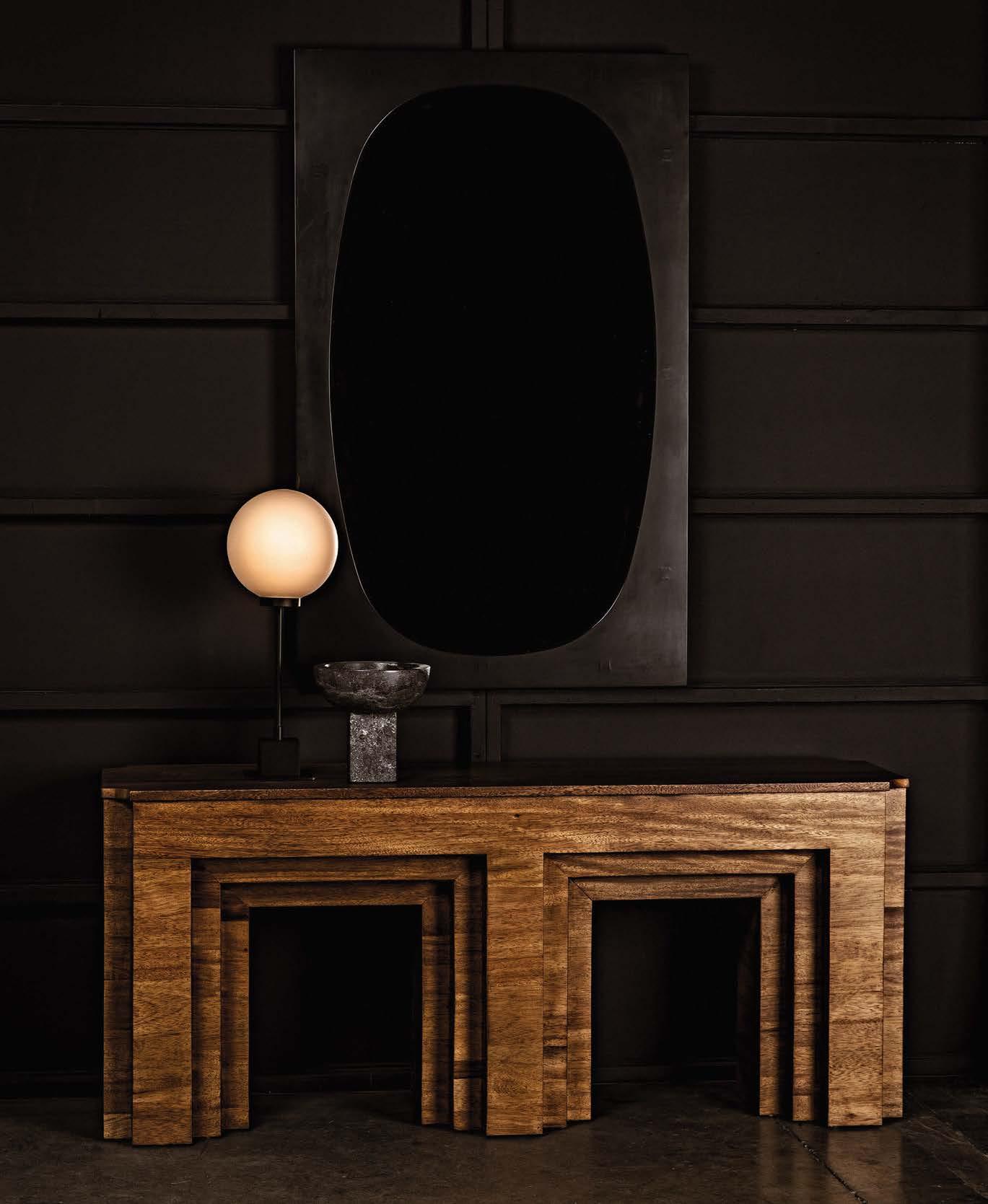 Above: Uttermost’s Rehema chair makes an architectural statement in this guest bedroom corner alongside a natural teak stool by Four Hands and Mr. Brown London’s Totem floor lamp. Noir’s bleached-walnut Weave sideboard sits near The Beach Party print by pop artist Nelson De La Nuez.