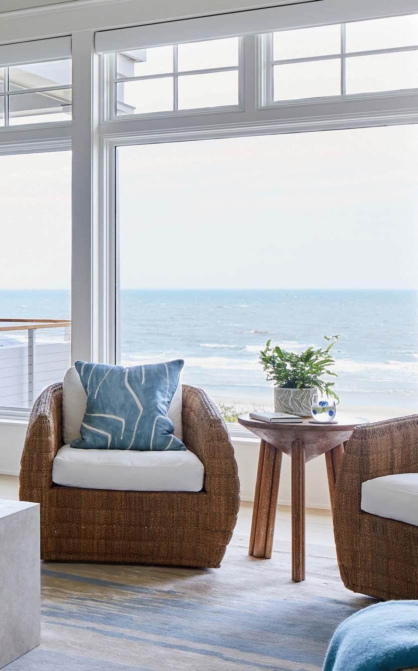 Bischofberger and Walsh appointed such spaces with a stated goal of connecting the interiors to the seascape beyond. Finishing touches such as a handwoven rug customized to mimic the sand and ocean tides bring balance to the great room complete with a reclaimed timber ceiling. “Thanks to the architect’s vision, the windows are so well positioned it’s like being on a cruise ship; all you see is water,” adds Bischofberger, who teamed with Walsh to place an oversize, sandtoned sectional large enough for both Benita and Joe to lounge comfortably. Meanwhile, an oak sideboard with a driftwood finish buffers the sofa and breaks up the sea of upholstery while doing double duty as a dining area storage piece.