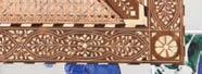 Odom painted the primary suite’s fireplace surround Farrow & Ball’s Setting Plaster, accenting it with a round encaustic artwork, Ganymede’s Dream, by Michele Schuff. The geometric motif of 19th-century Spanish chests from Provenance Antiques complements draperies of Kerry Joyce’s Best Buds textile from Ainsworth-Noah.