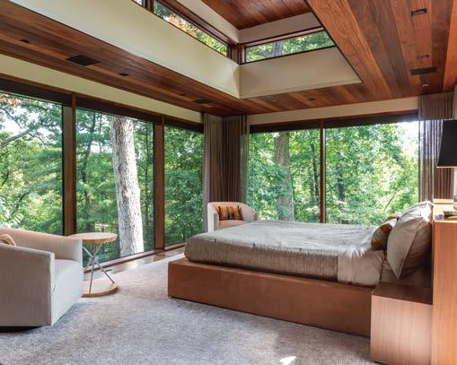which lends itself to reinforcing the concept in the interior.” Replicating the existing trim, he installed wall paneling that emphasizes the newly resized dining room. Upstairs in the primary suite, balance again plays a key role, as seen in the custom his-and-hers vanities—conceived by Anderson and his team—flanking a large window.