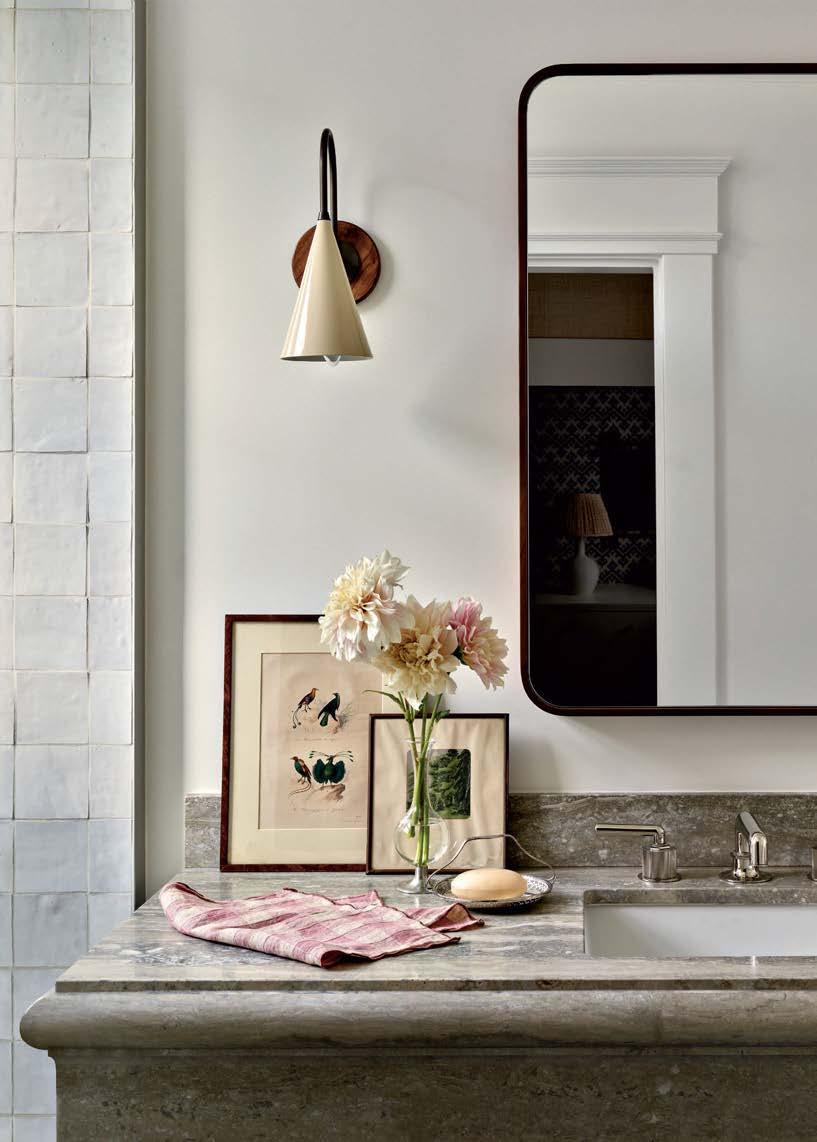 Above: A wall of zellige tiles from clé adds textured charm to the sons’ bathroom, complementing a travertine vanity and Waterworks faucet. A Rejuvenation walnut mirror and delicate Solana sconce by Blueprint Lighting complete the space.