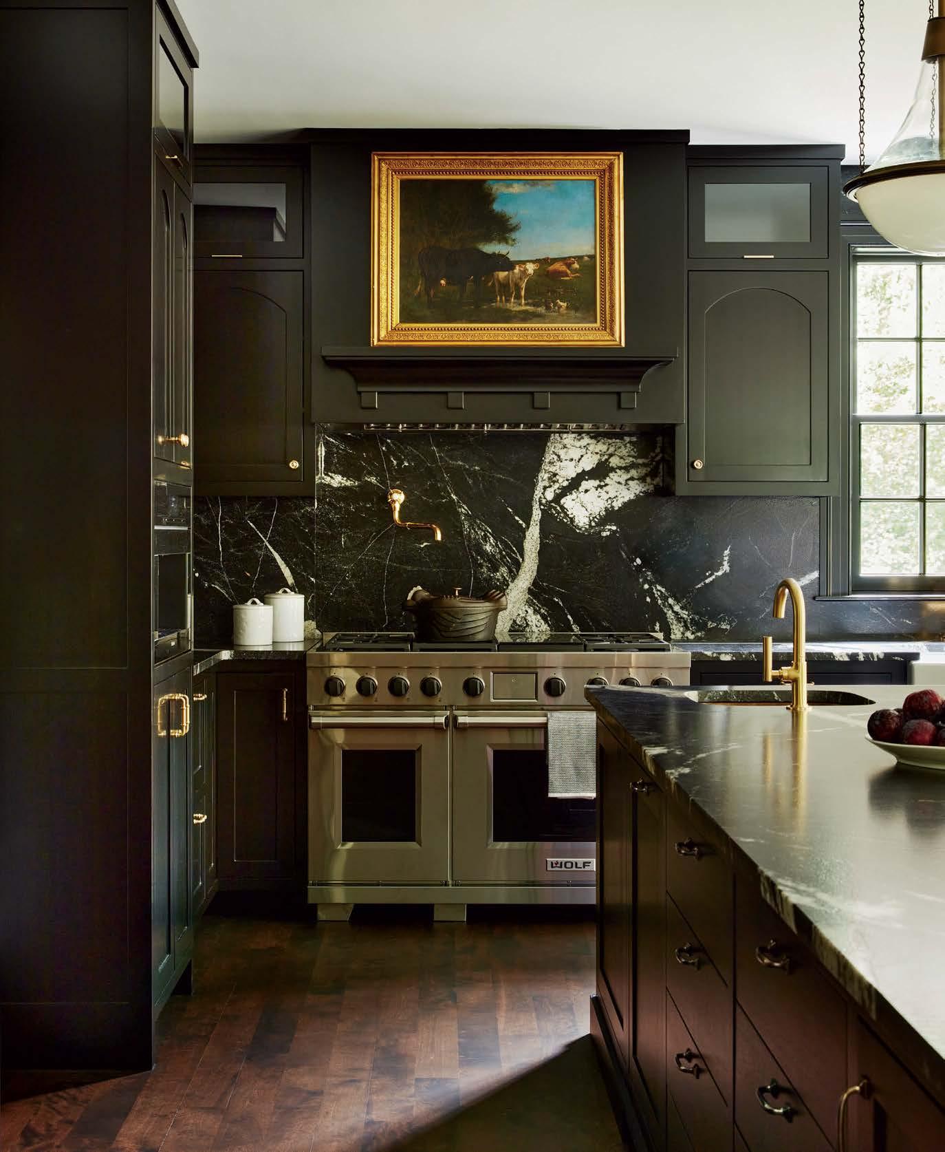 original servant stair made room for an expanded kitchen and breakfast area. Yet the new cabinetry still hums in architectural harmony, with “custom Shaker-style drawer and door fronts that mimic a British style,” the architect describes. Grayed blue paint completes the space’s vintage-tinged quality.