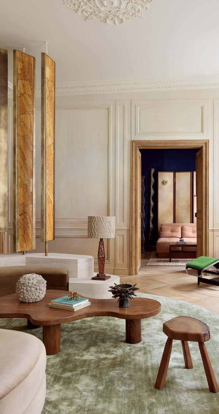 Right: Farrow & Ball’s Skimming Stone coats the dining room’s new wall paneling, while a Stark rug adds pattern underfoot. The bespoke walnut sideboard is topped with a Porta Romana table lamp from Kneedler Fauchère.