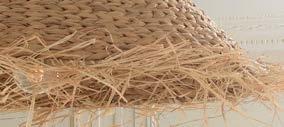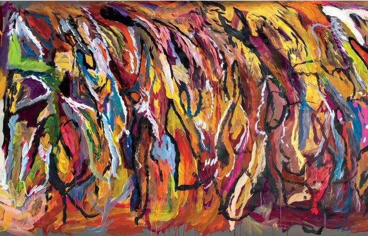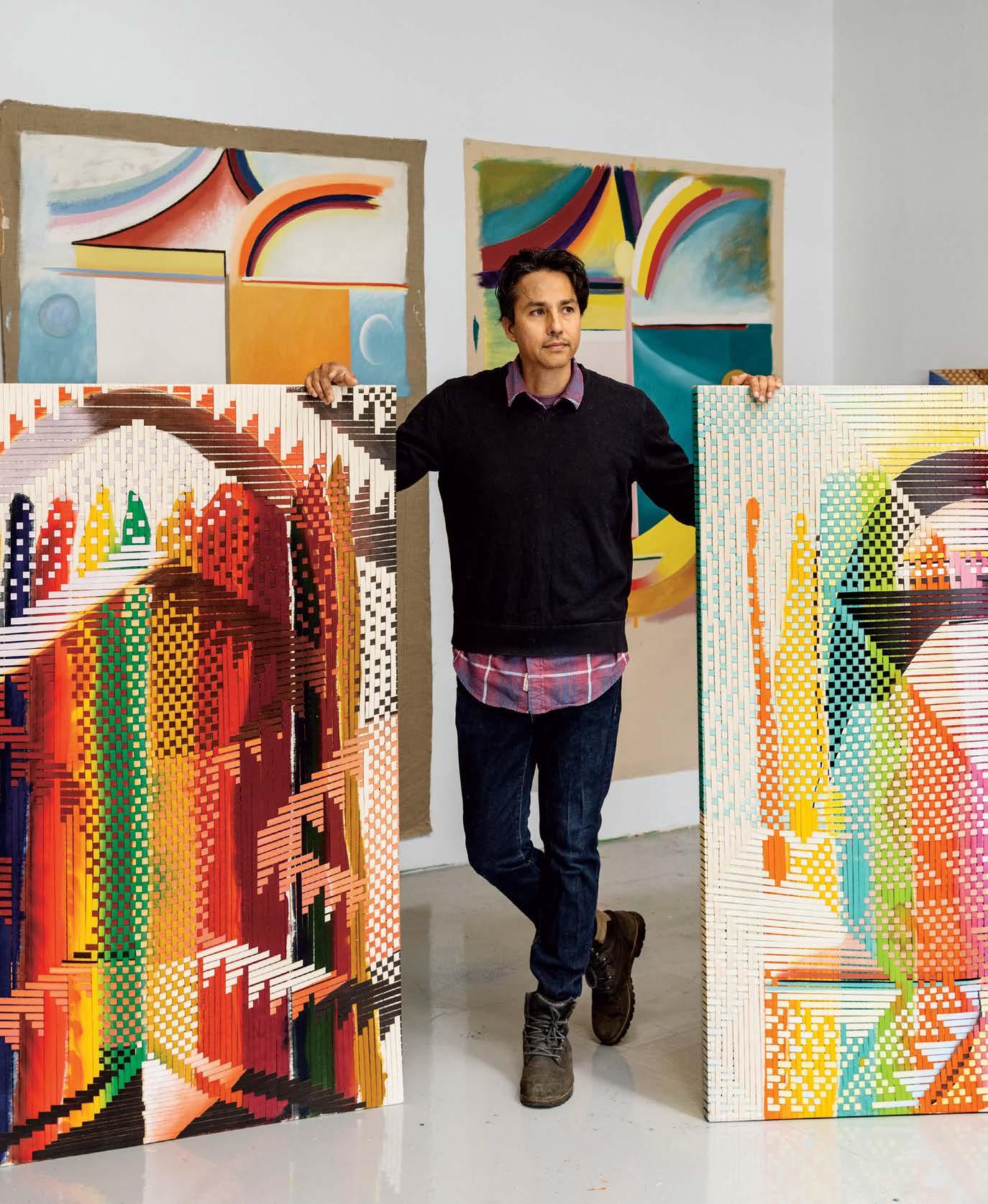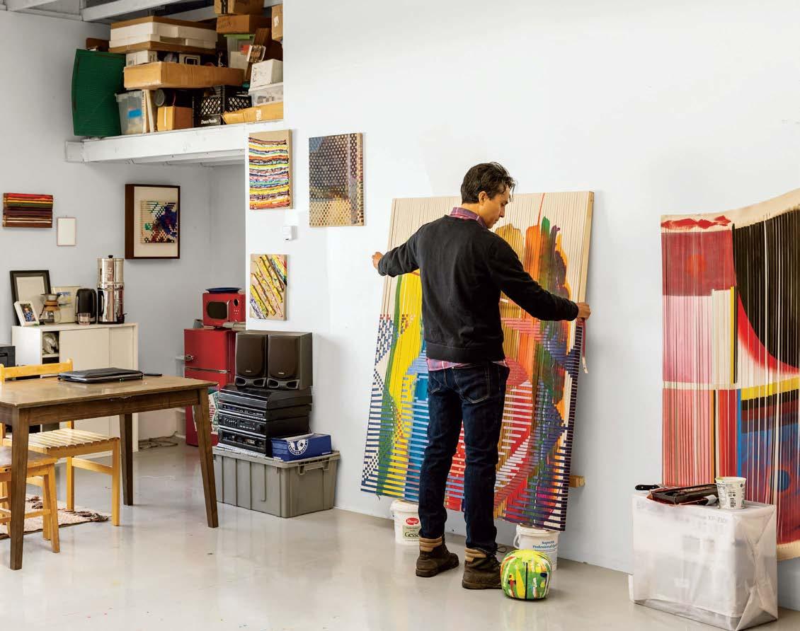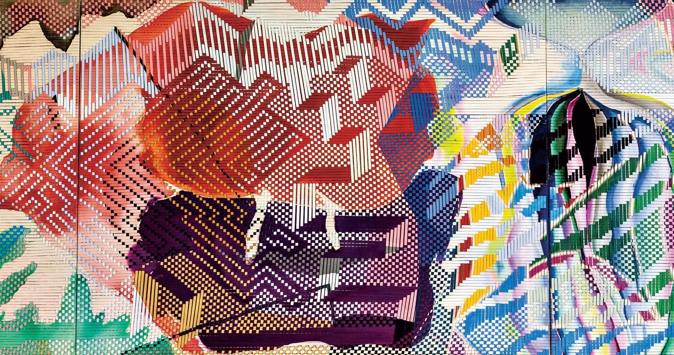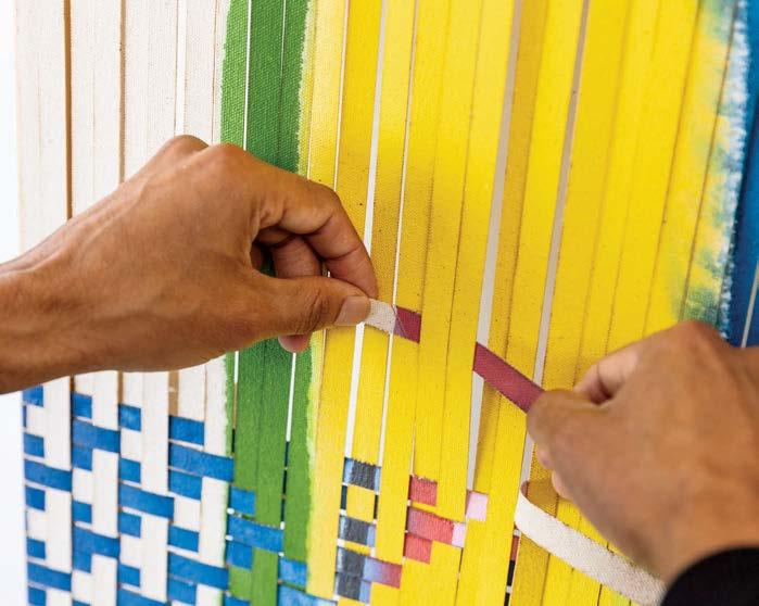 Artist Miguel Arzabe’s process involves creating paintings (left) that will be cut into strips that he then weaves (below) into new artworks, like La Cara Rayada IV, 2023 (opposite). Todos Bienvenidos 2023 (bottom) is a piece commissioned for Houston’s George Bush Intercontinental Airport.