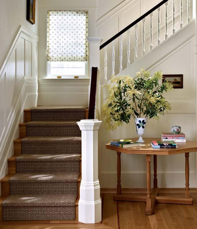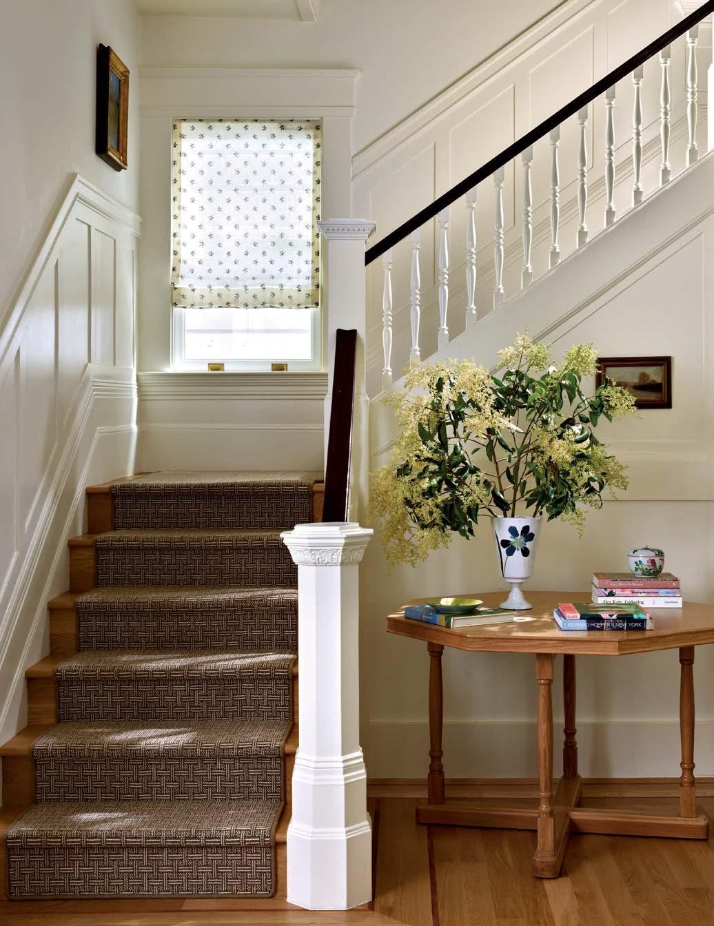 By the foyer staircase, an octagonal white oak entry table by designer Leah O’Connell displays a John Derian for Astier de Villatte vase. Prestige Mills’ Templeton runner softens the stair treads, while a Roman shade made with a Décors Barbares fabric adorns the window.