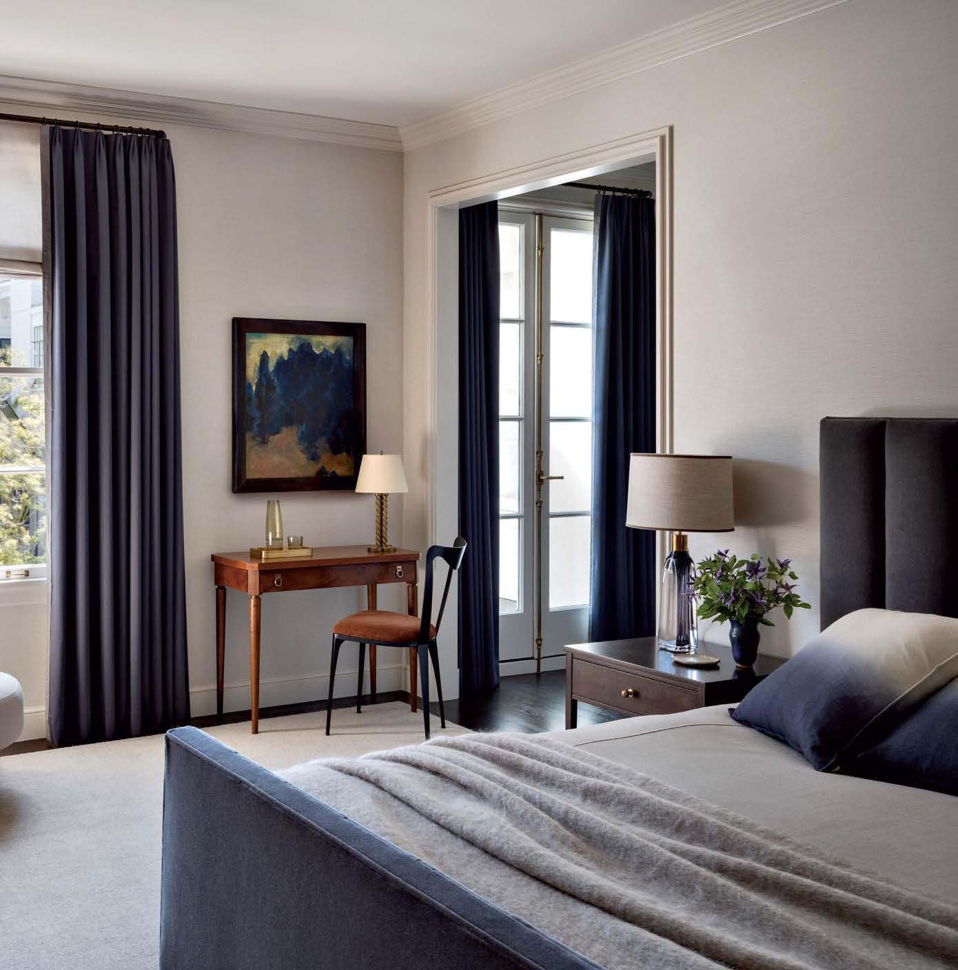 Right: The primary suite features a bespoke bed upholstered in a Rogers & Goffigon mohair. A Phillip Jeffries wallcovering and drapery made with Opuzen fabric strike quiet notes. Beneath a painting by Edith Park Truesdell are a T.H. Robsjohn-Gibbings desk and Tom Faulkner chair.