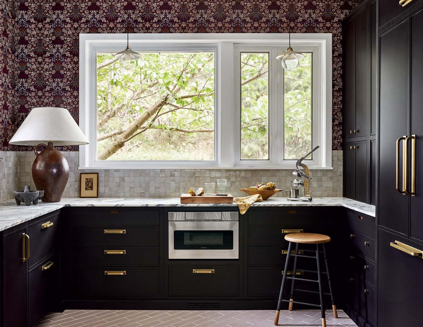 Above: Tucked beneath the staircase, the powder room is enlivened by Cole & Son’s Florencecourt wallpaper. The Watermark faucet, Rejuvenation mirror and sconces by The Urban Electric Co. introduce glimmers of brass.
