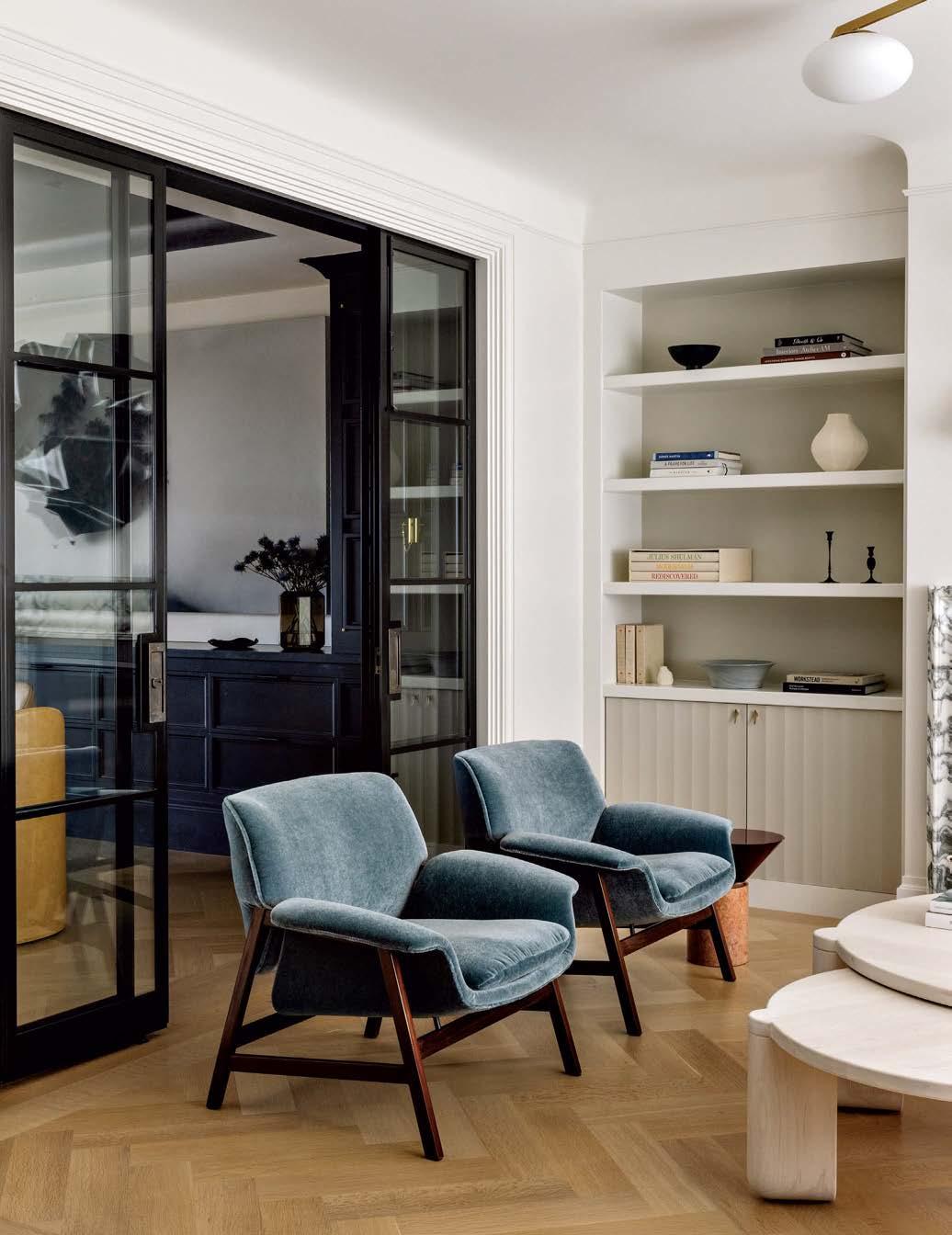 The furniture and accessories throughout meld new and old, with an emphasis on the latter. “We love pieces that have a story or some age and soul to them,” Anderson notes. For example, the designer and his team paired a 1930s game table with cane-back Edward Wormley chairs in the living room. The client shares this sentiment and, as Anderson says, “appreciates a good mix.” Her preference for a midcentury sensibility permeates the abode, evident in the Paul McCobb walnut-framed armchairs she discovered and brought to the project.