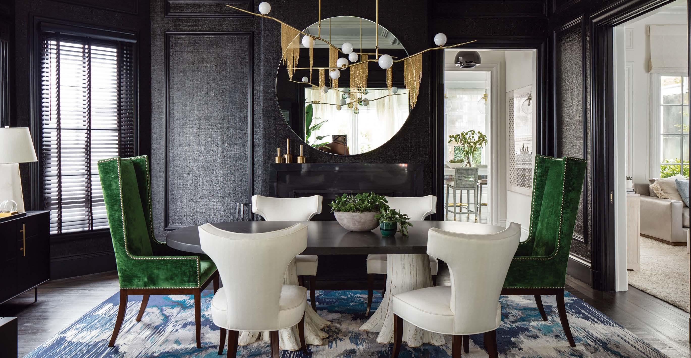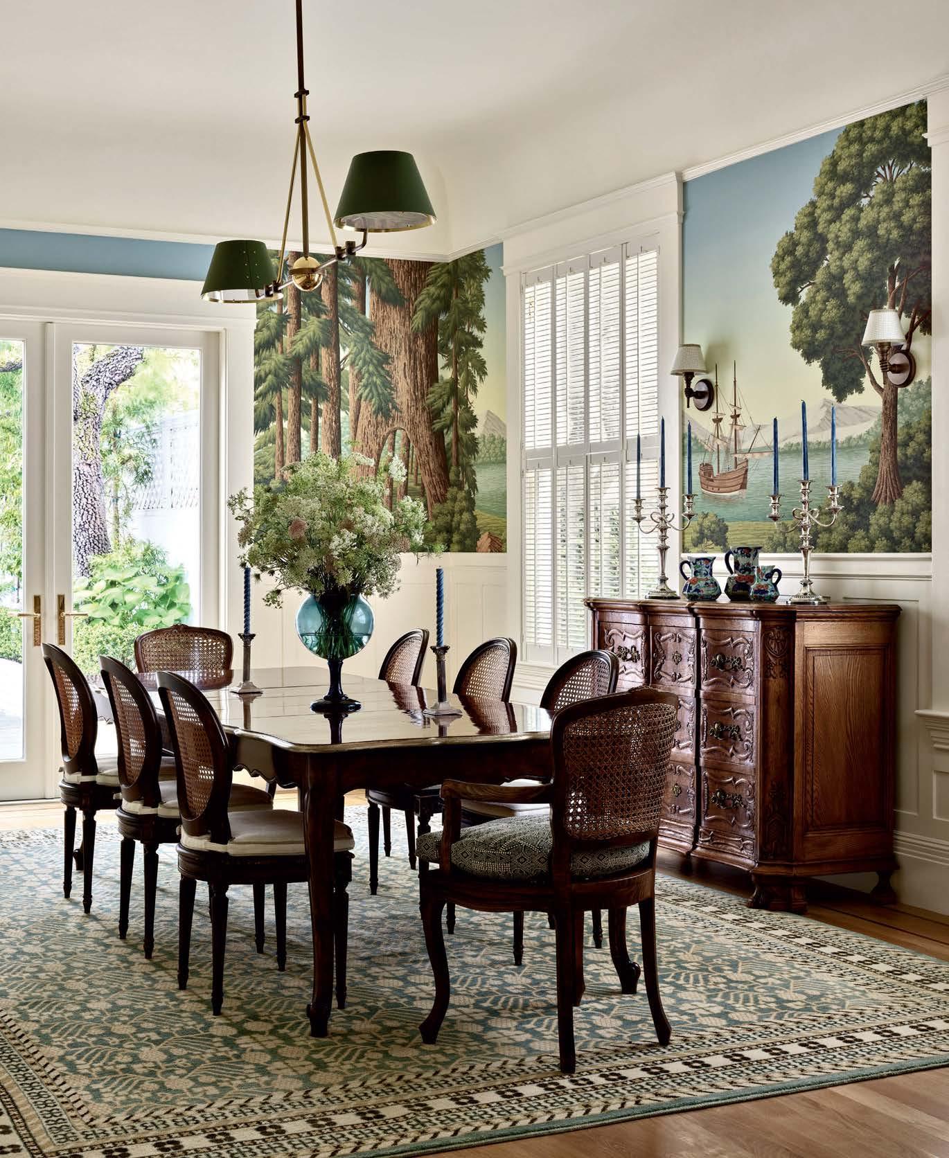 Opposite: Hand-painted wallpaper surrounds the reimagined dining room. Fixtures by The Urban Electric Co. illuminate the antique furnishings, set atop a rug from Eliko Rugs by David Ariel.