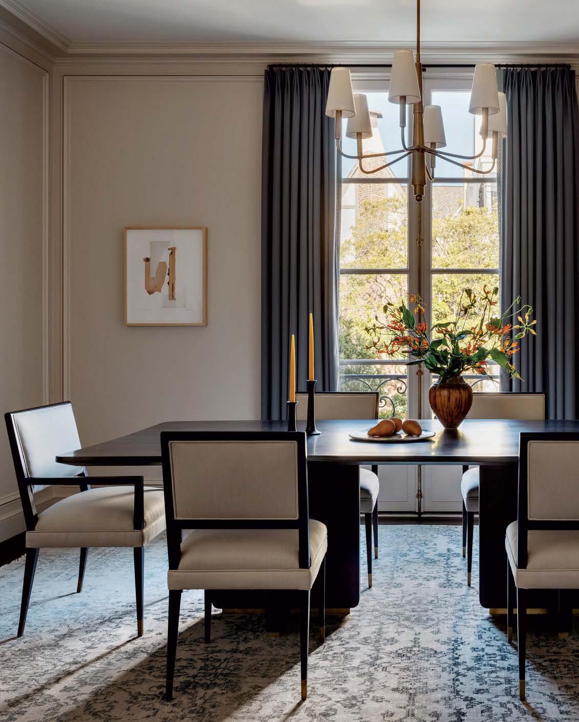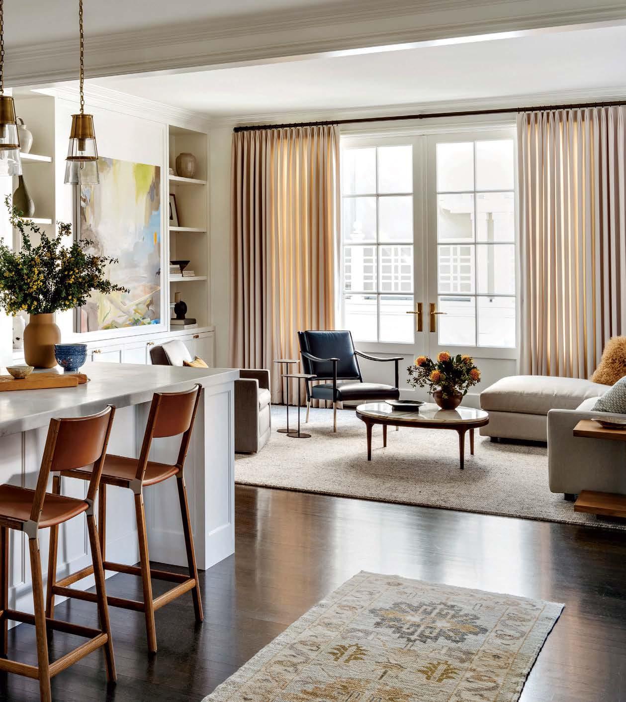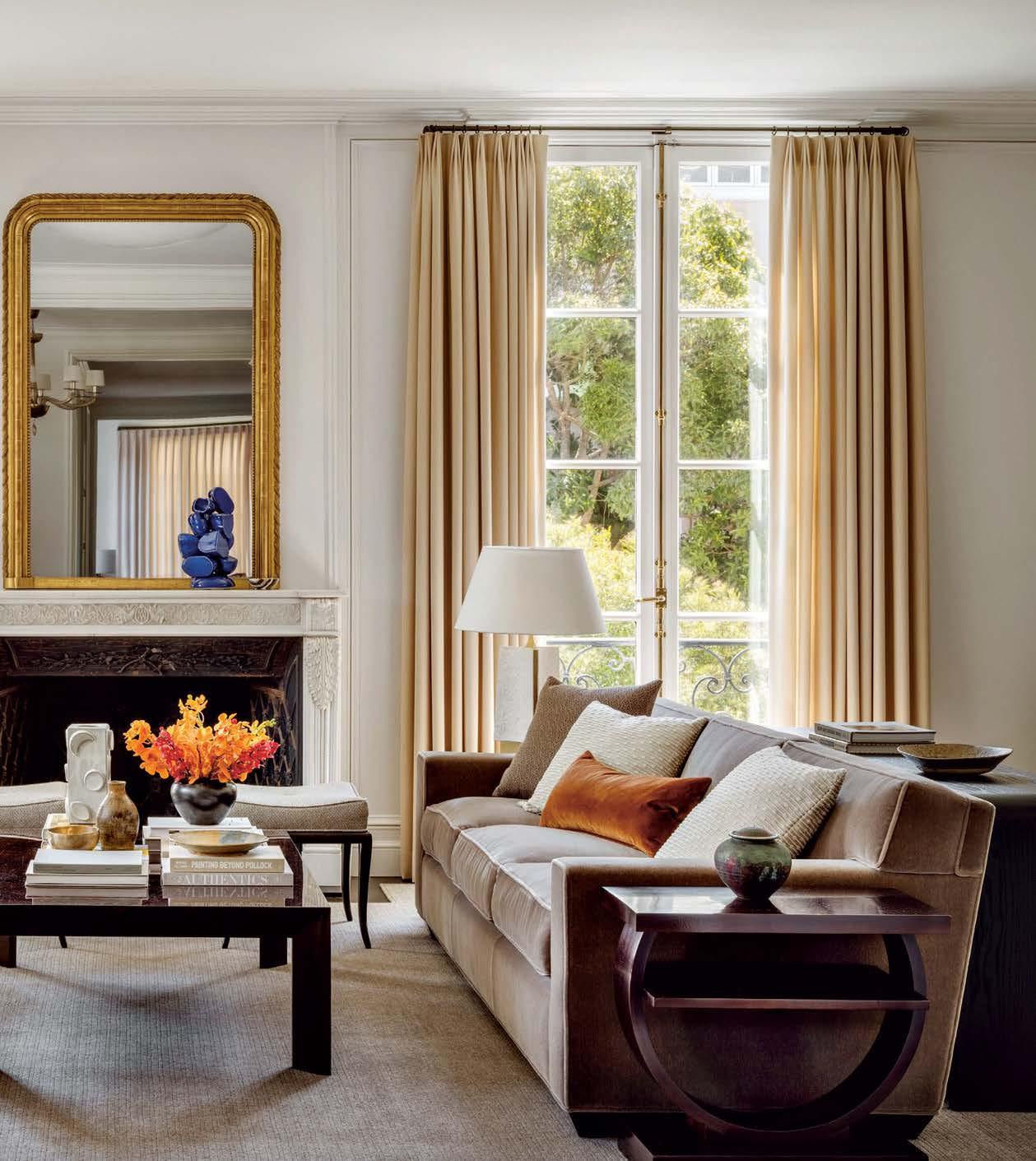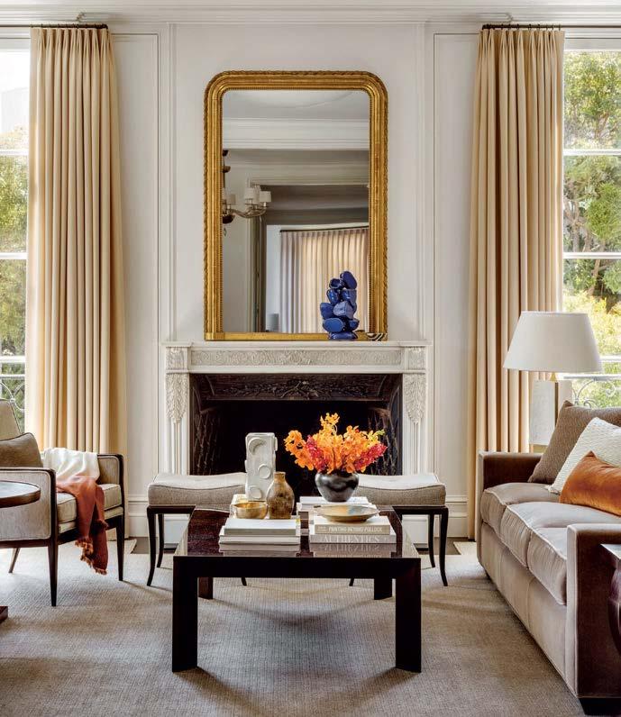 It all started with a leaky roof— unwanted water seeping into the walls of a pre-1906 earthquake Edwardian in Pacific Heights. Not only did the elements imperil the original 1899 millwork, but they also endangered a lifetime of memories for the owner. This abode is her childhood home and the place she and her husband raised their two college-aged sons. Repairs and updates were needed, but any renovation had to remain faithful to decades of family nostalgia. They entrusted the extensive remodel to designer and long-time family friend Leah O’Connell, who treasured her own youthful memories of the house. “This family and home have forever been in my orbit, so the project was close to my heart,” she shares. Joined by architect Brooks McDonald and general contractor JB Ferrarone, she approached changes with a tender eye to the past. “We had to take this house down to the studs and put it back up exactly as it would have been—but a little better,” the designer adds. The work included replacing the original box sash windows with faithful reproductions—doublepaned models this time for better insulation. The interior baseboard, trim and decorative handcarved millwork received the same meticulous treatment, with worn and damaged pieces “removed, refurbished and reinstalled,” Ferrarone says. “Anything that needed to be built was an exact replica of the original.” Less-than-authentic features that were added by prior generations, like the dining room’s shutters, were also recreated out of sheer affection. “For the family, those shutters have always been there,” O’Connell shares. “There were many sentimental choices like that because they hold a lot of memories.”