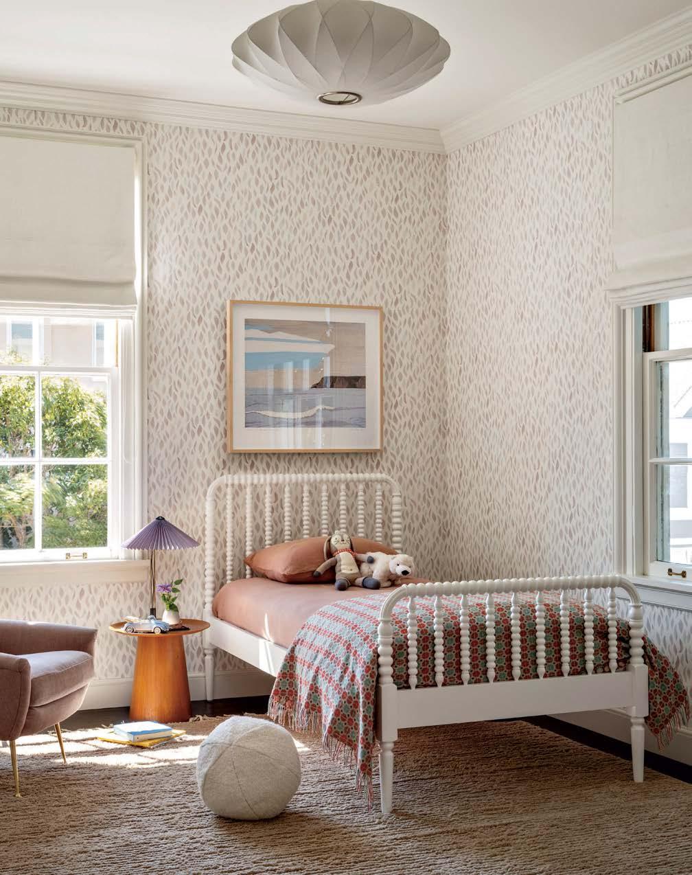 Above: In the daughter’s room, Rebecca Atwood’s Petals wallpaper, an Armadillo rug and shades made with a Calvin Fabrics textile foster a serene setting. The George Nelson for Herman Miller pendant light hangs above a Crate & Kids bed and artwork by Gaétan Caron.