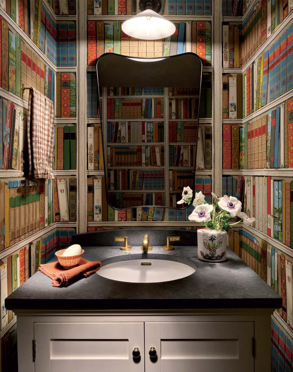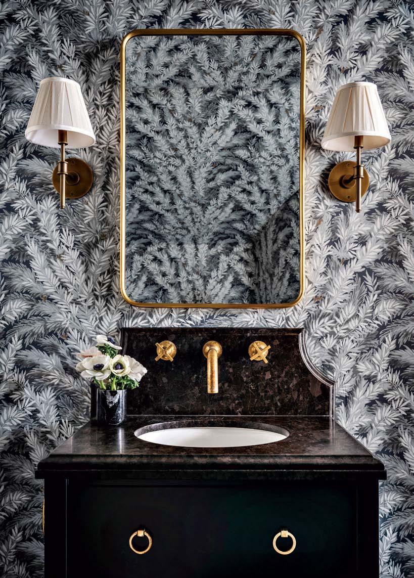 Above: Brunschwig & Fils’ playful Bibliotheque wallpaper envelops the powder room, accented by a Gio Ponti for Gubi mirror and Hector Finch light fixture. A Kallista faucet adorns the vanity’s marble countertop.