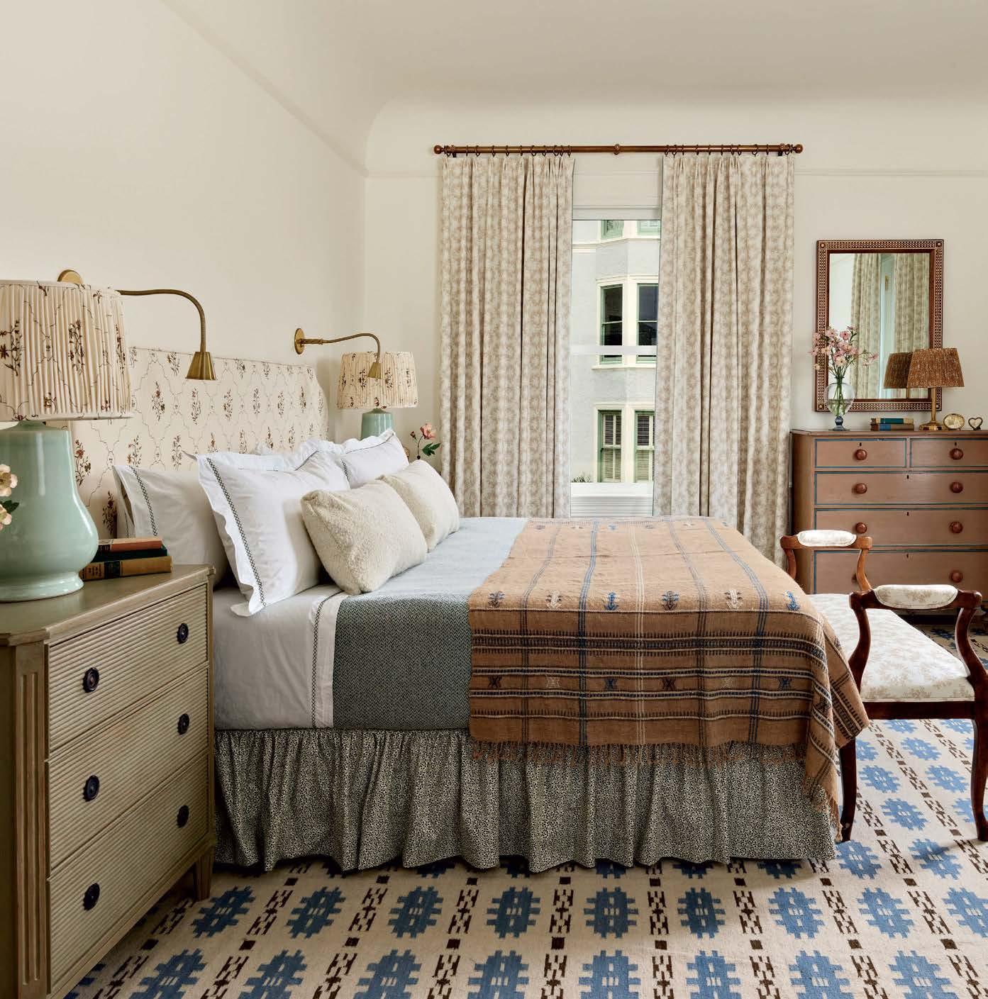 Left: Leah O’Connell Textiles pieces fill the couple’s bedroom, from a Heathcliff rug to drapery and a bench featuring the Lolly motif. A Soane Britain print is used for both the headboard and the Stephen Gerould lamps’ shades. The nightstand is by Chelsea Textiles.
