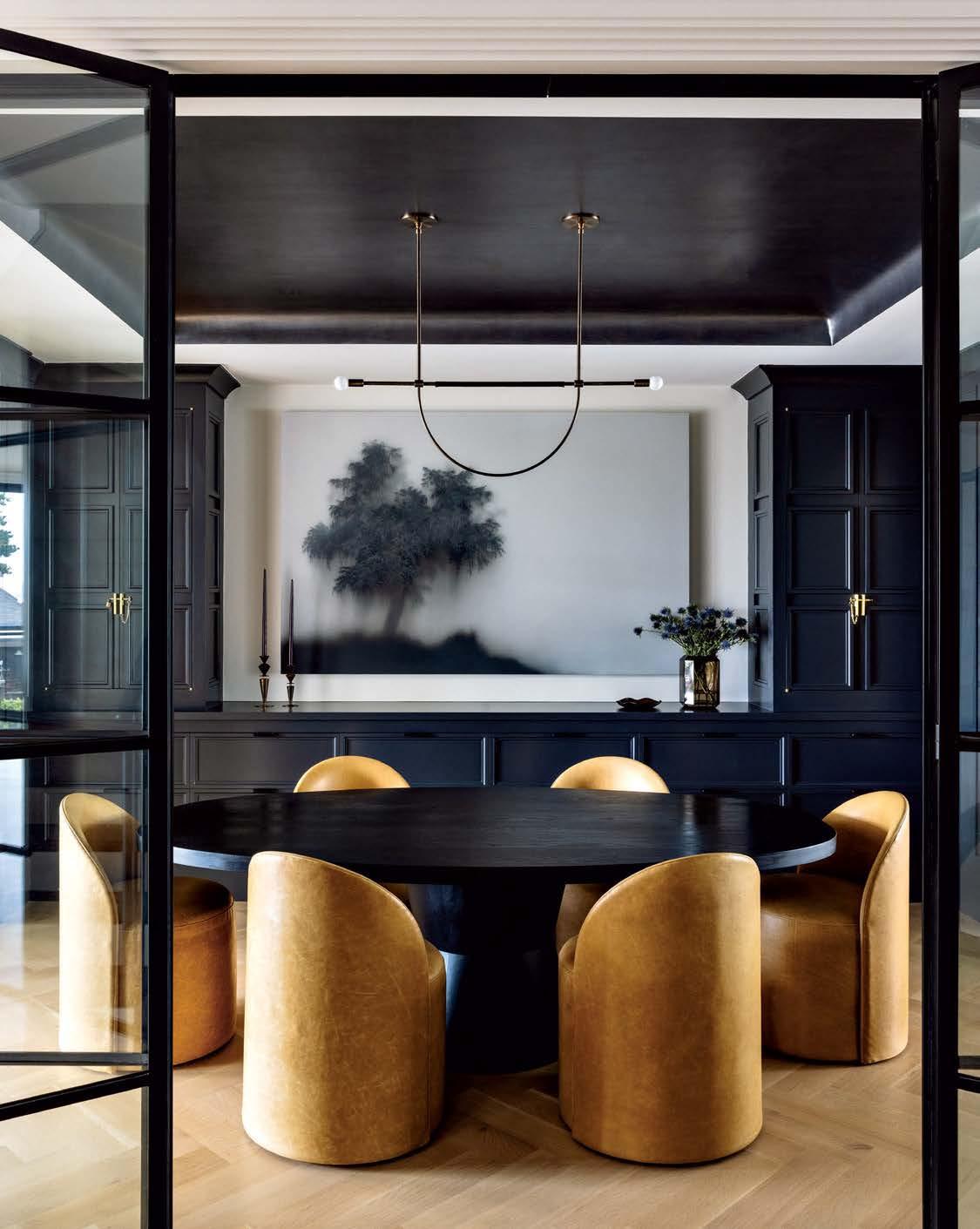 Above: In the dining room, three walls of glass-paned doors by Atelier Domingue Steel Windows & Doors ensure the space is filled with light. The moody-hued cabinetry is coated in Benjamin Moore’s Wrought Iron.