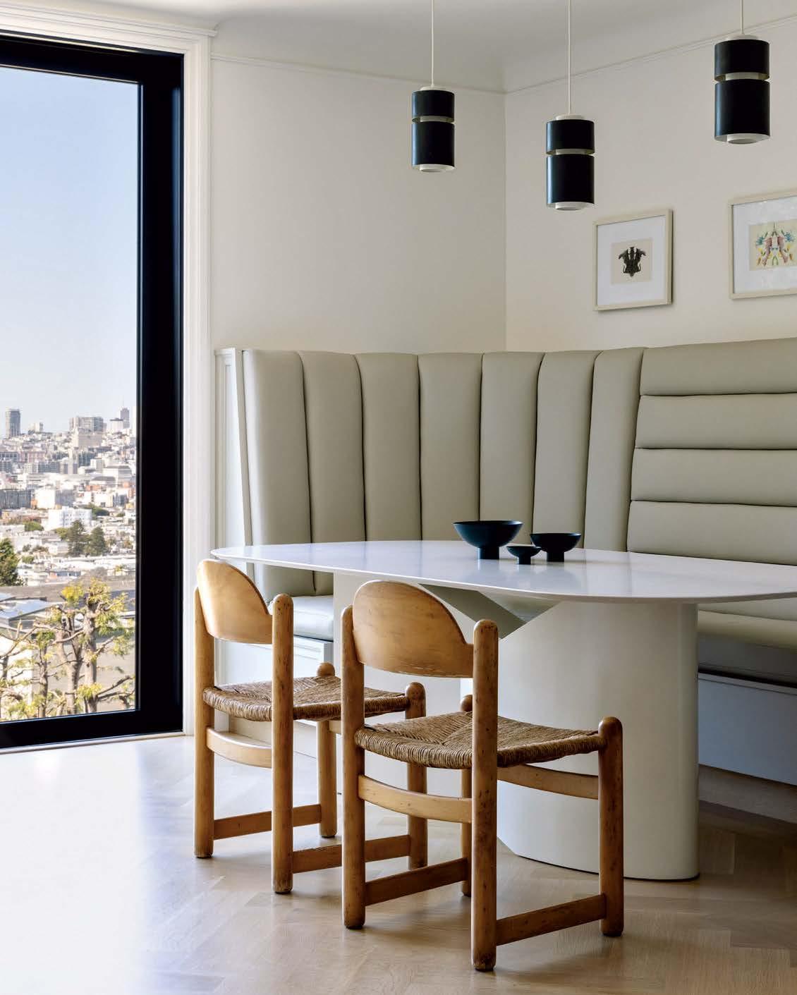Opposite: A pair of Hank Lowenstein’s oak-and-rush Padova dining chairs from Hunt sidle up to the breakfast room’s custom table and channel-tufted banquette. Overhead is a trio of vintage pendants.