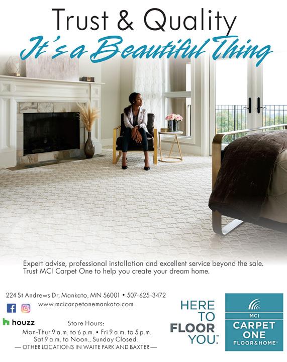 • WEDDINGS • EVENTS • CONFERENCES Book Today! 507-625-7984 historicmasonichall.com events@historicmasonichall.com 202923 virtual tour siestahillsliving.com steve 507-327-8411 pete 507-381-0400 Owner is licensed Real Estate Agent 208406 Compeer Financial, ACA is an Equal Credit Opportunity Lender and Equal Opportunity Provider. NMLS #619731 ©2022 All rights reserved. Lindsey Anderson, Lending Officer NMLS 688349 D:(507) 344-5020 | C:(507) 995-5718 Lindsey.Anderson@compeer.com YOUR RURAL HOME LENDER 205085 210496 100 Warren St. Suite 347 | Mankato 507.769.0828 | synergyhomecare.com -Personal Care -Companionship -Medication Reminders -Meal Preparation -Assist with Pet Care -Light Housekeeping -Assistance Getting Ready -Memory Care -Fall Prevention -Exercise Encouragement own FromIn-HomeConsultations ExpertAdvice& CLAWS + PAWS FLOORING SALE $0 18 Month Special Financing Down Interest *Subject to credit approval. Minimum monthly payments required. See store for details. Sale Ends June 27, 2022 224 St Andrews Dr, Mankato, MN 56001 507-625-3472 • www.mcicarpetonemankato.com Store Hours: Mon-Wed 9am-6pm, Thurs 9am-7pm, Fri 9am-5pm, Sat 9am-3pm, Sun Closed 195515 CT-SPAD0118132509 FromIn-HomeConsultations ExpertAdvice& ProfessionalInstallation We are by yoursidethrough theentireprocess! 224StAndrewsDr.,MankatoMN 507-625-3472 www.mcicarpetonemankato.com StoreHours:Mon- Wed9am-6pm,Thurs9am-7pm,Fri9am-5pm,Sat 9am-3pm,Sunclosed • Hard & Soft Surface Flooring • Window Treatments • Countertops & Cabinets 198584 157483 New Ulm 507-233-8440 Madelia 507-642-8444 “YOUR HOME IS OUR BUSINESS” New Ulm 507-233-8440 Madelia 507-642-8444 “YOUR HOME IS OUR BUSINESS” Building Materials - Idea Showroom “YOUR HOME IS OUR BUSINESS” New Ulm 507-233-8440 Madelia 507-642-8444 Offering RadiationFree, Safe, FDA Cleared Adjunctive Screening for Breast Cancer and Thyroid Pathology 150 St Andrews Court #520 • Mankato 507.246.6262 • smnthermography.com SCAN QR CODE TO BOOK YOUR APPOINTMENT • New Ulm 507-354-WASH (9274) www.thetunnelcarwash.com thetunnelcarwash@gmail.com 186858 Hwy 15 South • New Ulm, MN (507) 233-8823 www.JensenMotors.com Kerry CARS WITH Kerry Hoffman | Sales Associate 205373 198707 Auto Body Repair Auto Glass Repair & Replacement National Lifetime Limited Warranty 507.388.4895 1671 E Madison Ave Mankato