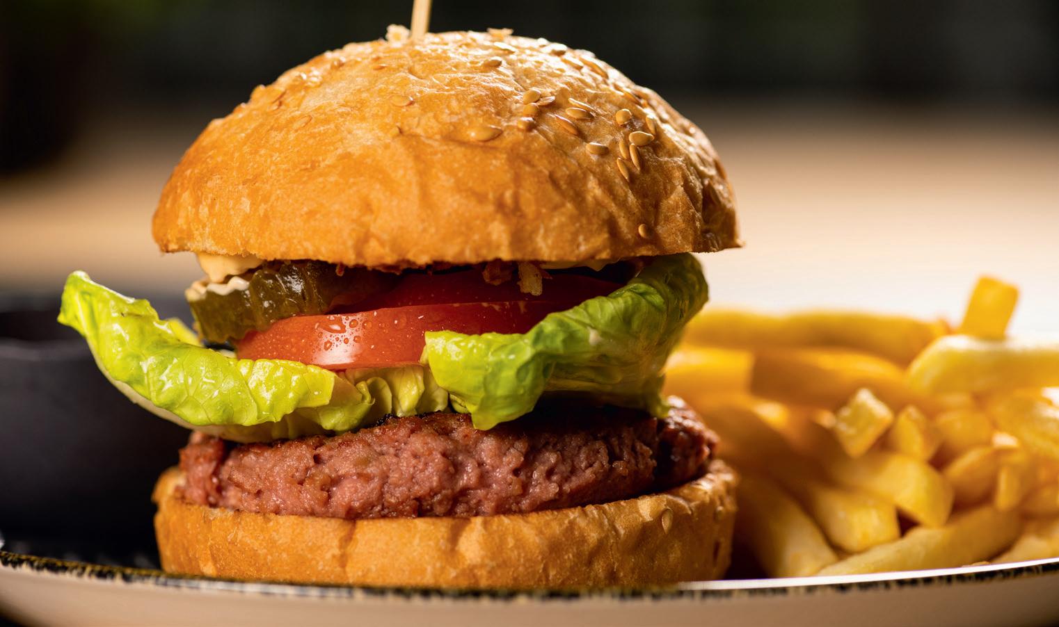 ce steak végétal, qui ressemble à s’y méprendre à un steak clas sique. Ajoutez un bon bun, du cheddar, de la salade, des tomates et des frites, et voilà un burger on ne peut plus américain !