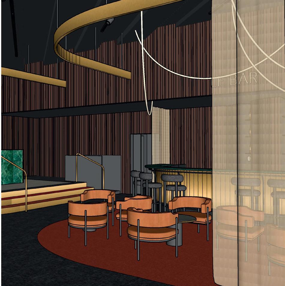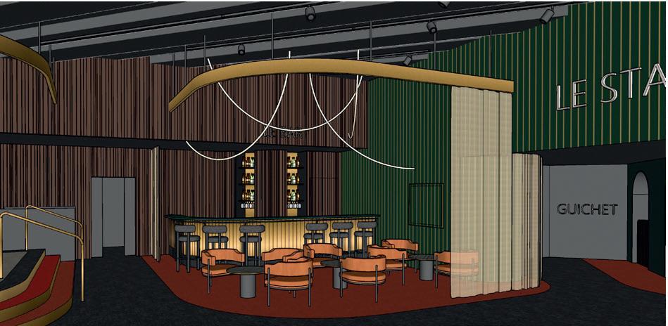 Face à la salle des tables, il fallait qu’il soit classique, il garde d’ailleurs les courbes traditionnelles d’un bar, et le voilage un peu théâtral accentue ce côté, mais il est aussi à côté du Stadium, on a ajouté des codes plus modernes avec le devant du bar en métal noir, un mobilier plus graphique, des suspensions linéaires autrement dit des cordes rétroéclairées : on a l’impression de tubes de lumière qui flottent dans l’air. C’est beau et très graphique !