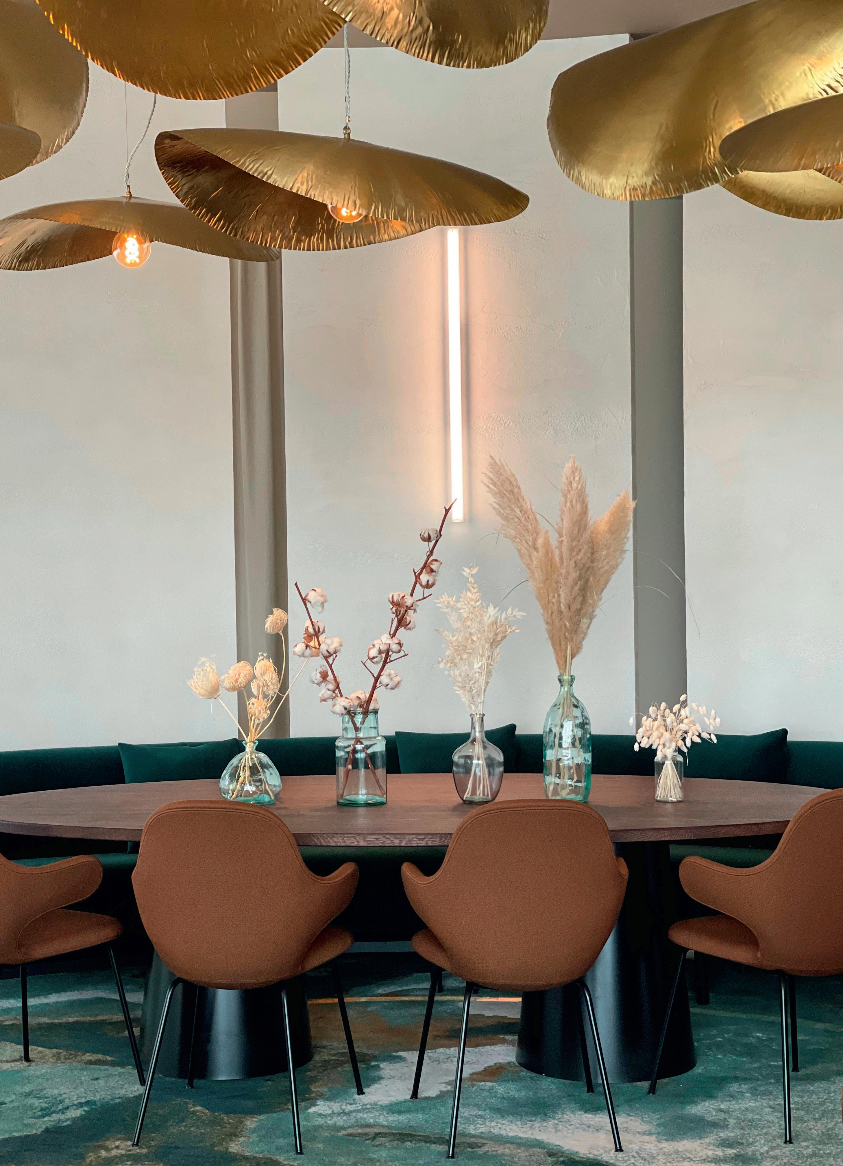 Messing ist in, nicht nur weil es für Geldmünzen verwendet wird, sondern auch weil seine Farbe wärmer und weniger aufdringlich ist als Gold und eleganter als Kupfer. Messingakzente bei der Inneneinrichtung verleihen Stil und Authentizität und können überall eingesetzt werden, ob in einem Art-déco-Intérieur oder im modernen industriellen Loft. Auch Designer nutzen das edle Material, um elegante Akzente zu setzen. Selbst kleine Elemente wie Kleiderhaken, ein Metallgriff an einer Schublade oder Tür, eine Leiste am Regal oder gar ein messingfarbener Spiegelrahmen verleihen der Einrichtung Eleganz und festlichen Glanz. Im Les Roses ergänzt das feine Metall neuerdings das neu gestaltete Interieur in Form von gehämmerten Messingblättern, die als Leuchten im Mittelteil des Restaurants schweben.