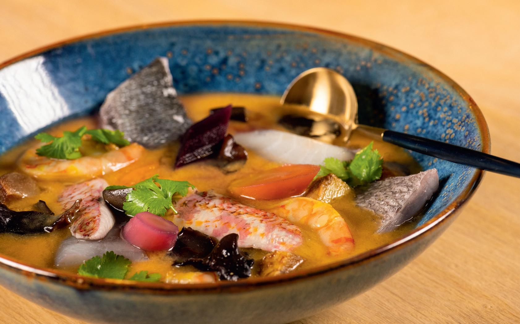 Amateurs de poissons : rendez-vous au Cameroun avec la Pépé soupe ! Cette nage de poissons, un peu comme une bouil labaisse, réunit cabillaud, rouget et gambas. Parfumée à l’hibis cus, elle est servie pimentée, avec des aubergines, des carottes et des gombos, légume typique de l’alimentation africaine. Et pour ceux qui préfèrent le poisson froid, le saumon mariné à la betterave est une recette du célèbre cuisinier britannique Jamie Oliver, revisitée par le chef du Purple Lounge : le saumon