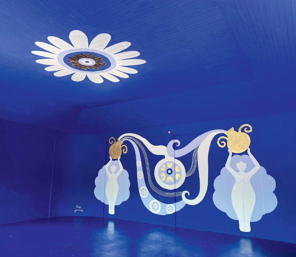 en faire un temple qui célèbre la relation entre la nature et la femme. « Dans mon travail, j’essaie de mettre en valeur le lien har monieux entre les femmes et la nature. C’est un motif qui ressort régu lièrement », détaille l’artiste. Sa couleur ? le bleu. « Une couleur très profonde, aussi celle du ciel, de l’Univers. L’inconscient, pour son côté intangible et sa profondeur, est souvent comparé à l’Univers… C’est pour ça qu’on dit que le bleu est sa couleur. » Avec le bleu, l’artiste dépeint son univers : le calme, la nuit, le rêve, la douceur, la femme. Au printemps dernier, elle a commencé une nouvelle activité : illustratrice de livre pour enfants. Avec son amie Marine Fonzeca, professeur d’anglais, elles ont sorti un conte écolo-fantastique en anglais, Waking the Mountain, publié par la maison d’édition luxembourgeoise Zoom. « C’était une très bonne expérience que nous souhaitons réitérer dans le futur », dévoile-t-elle. Cette touche-à-tout aux doigts de fée n’a pas fini de faire naître les étoiles dans nos yeux !