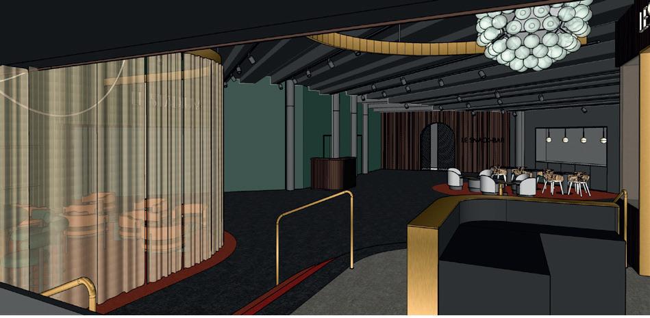 Et l’entrée de la salle des jeux de tables, juste en face ? Ce sera le pendant du bar. Les escaliers seront à contremarches en laiton, le poste de contrôle à l’entrée sera en Corian vert tandis que son comptoir sera en laiton, l’exact inverse du bar. Les courbes se répondent aussi ici. Le vitrage de la salle des tables sera fait de verre fumé avec des inserts de maille métallique en bronze. Cela donnera un côté très élégant : on pourra deviner ce qui se passe à l’intérieur sans voir vraiment.