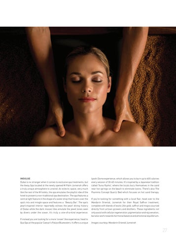 Iyashi Dome experience, which allows you to burn up to 600 calories every session of 30-60 minutes. It’s inspired by a Japanese tradition called ‘Suna Ryoho’, where the locals bury themselves in the sand near hot springs on the beach to eliminate toxins. There’s also The Psammo Concept Quartz Bed which focuses on hot sand therapy. If you’re looking for something with a local flair, head over to the Mandarin Oriental, Jumeirah for their Royal Saffron treatment, complete with blends of exotic 24k gold, saffron and mogra sourced directly from artisan growers and distillers. These ingredients not only assist with cellular regeneration, pigmentation and rejuvenation, but also work towards hormonal balance and emotional equilibrium. Images courtesy: Mandarin Oriental Jumeirah