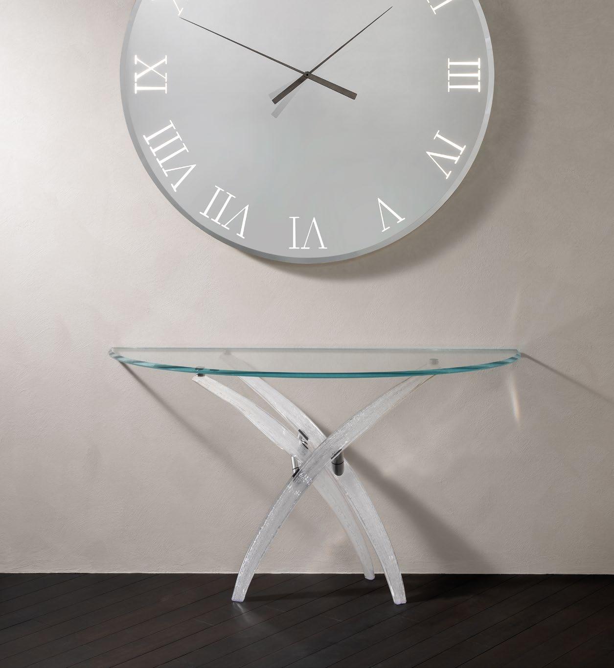 Legs attachment system REFLEX PATENT® FILI D’ERBA CONSOLE Design Tulczinsky Rugiada finish detail Legs in Murano glass Rugiada finish Top in extra-clear glass 135 x 45 x 72 h UFFICIO OFFICE CONSOLLE CONSOLES